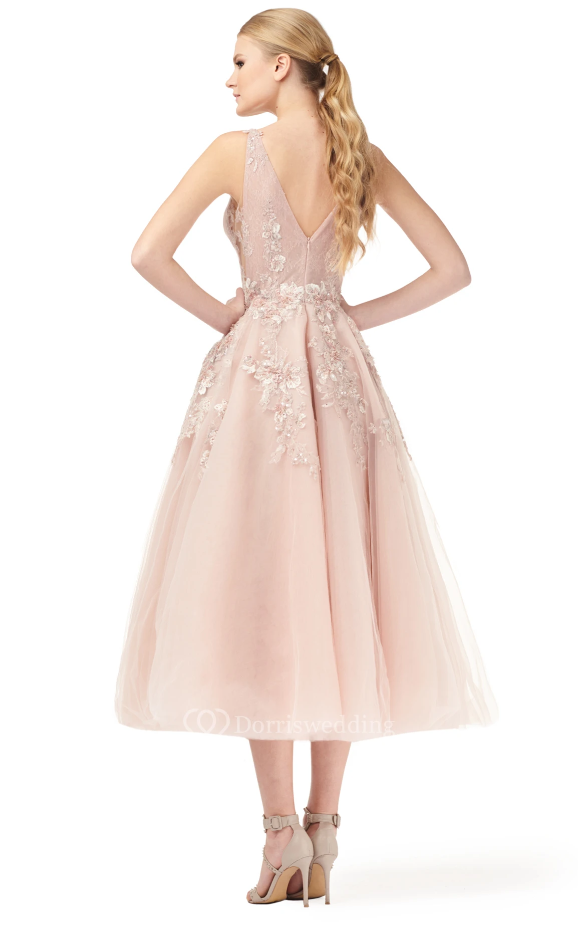 A Line V-neck Tulle Vintage Evening Dress with Appliques