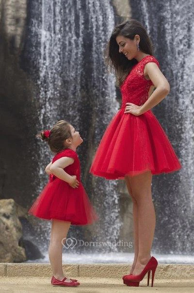 Lovely Red Lace Mother and Daughter Dress Tulle Short Cocktail Dress