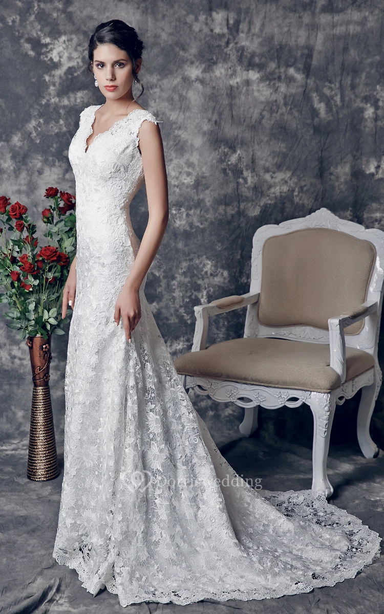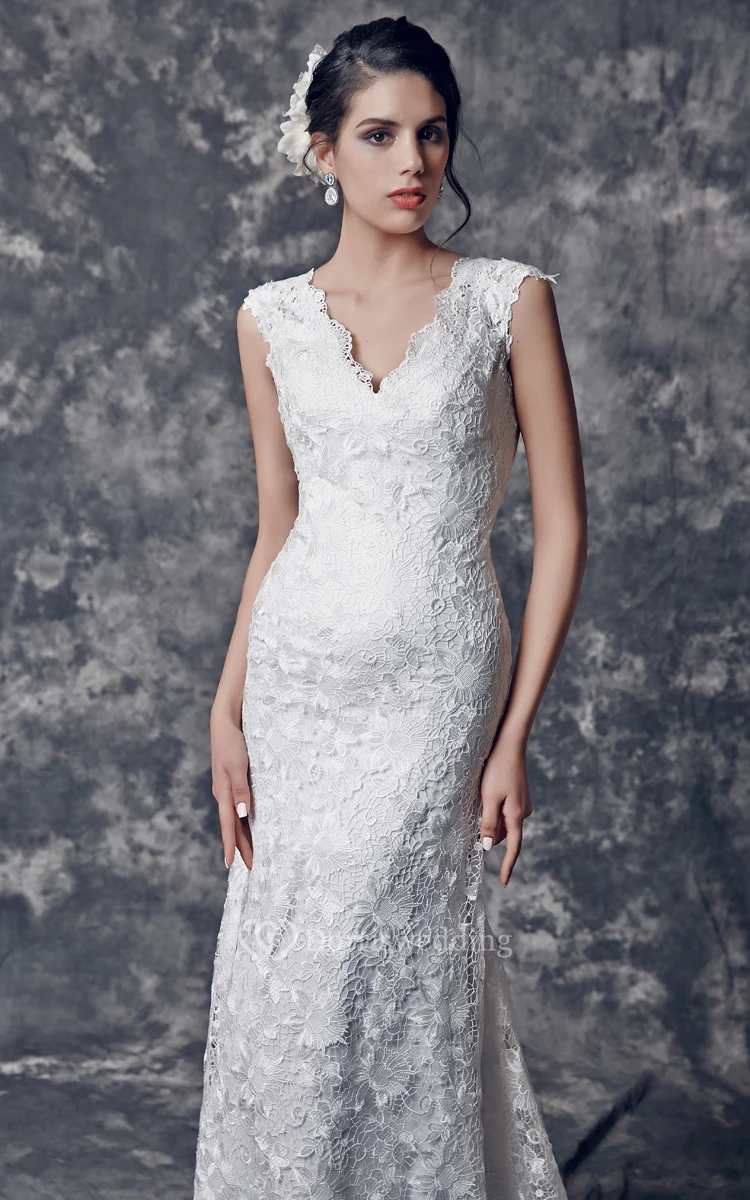 1920's Vintage-inspired V-shaped Back Cutout Brush Train Trumpet Lace Wedding Dress