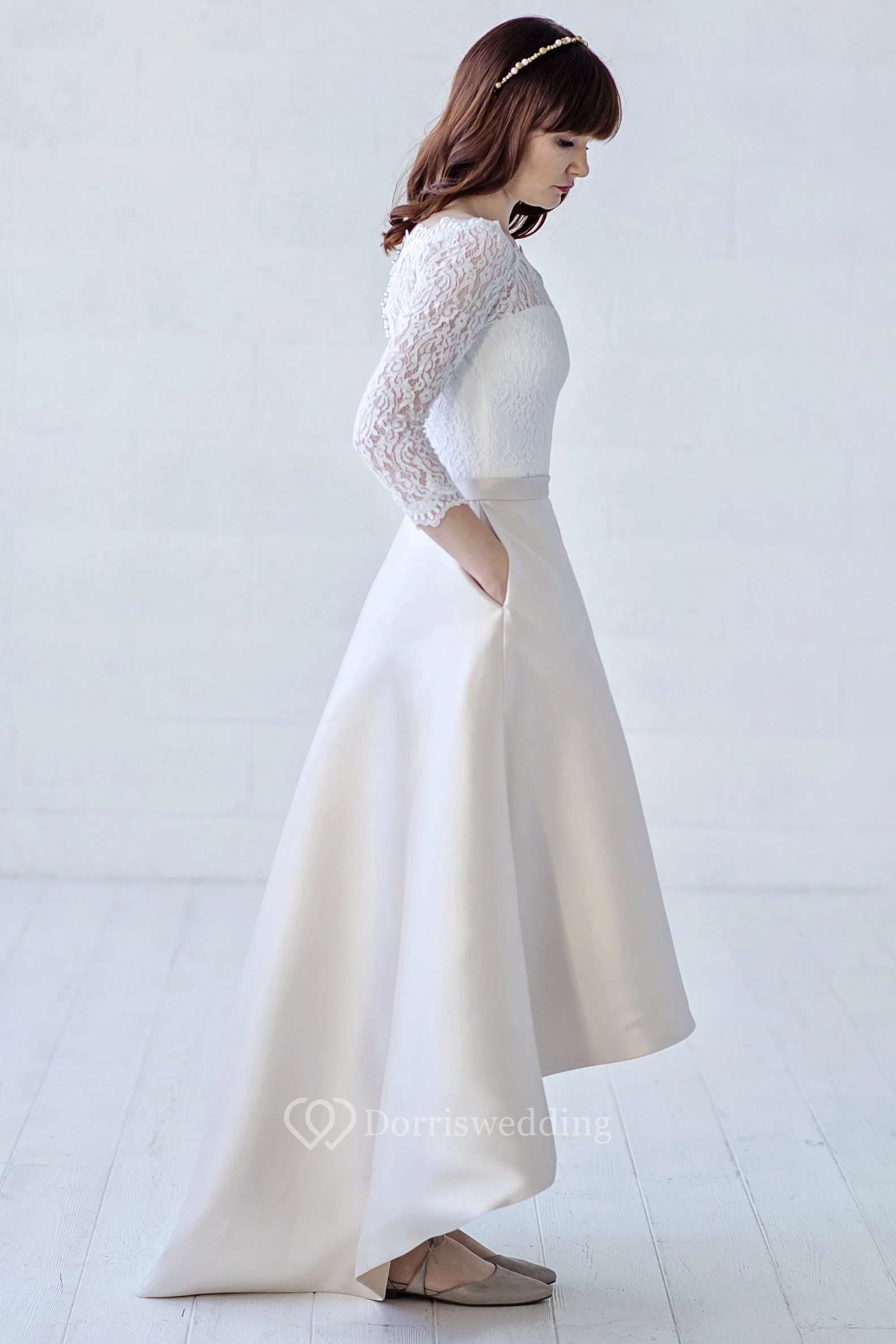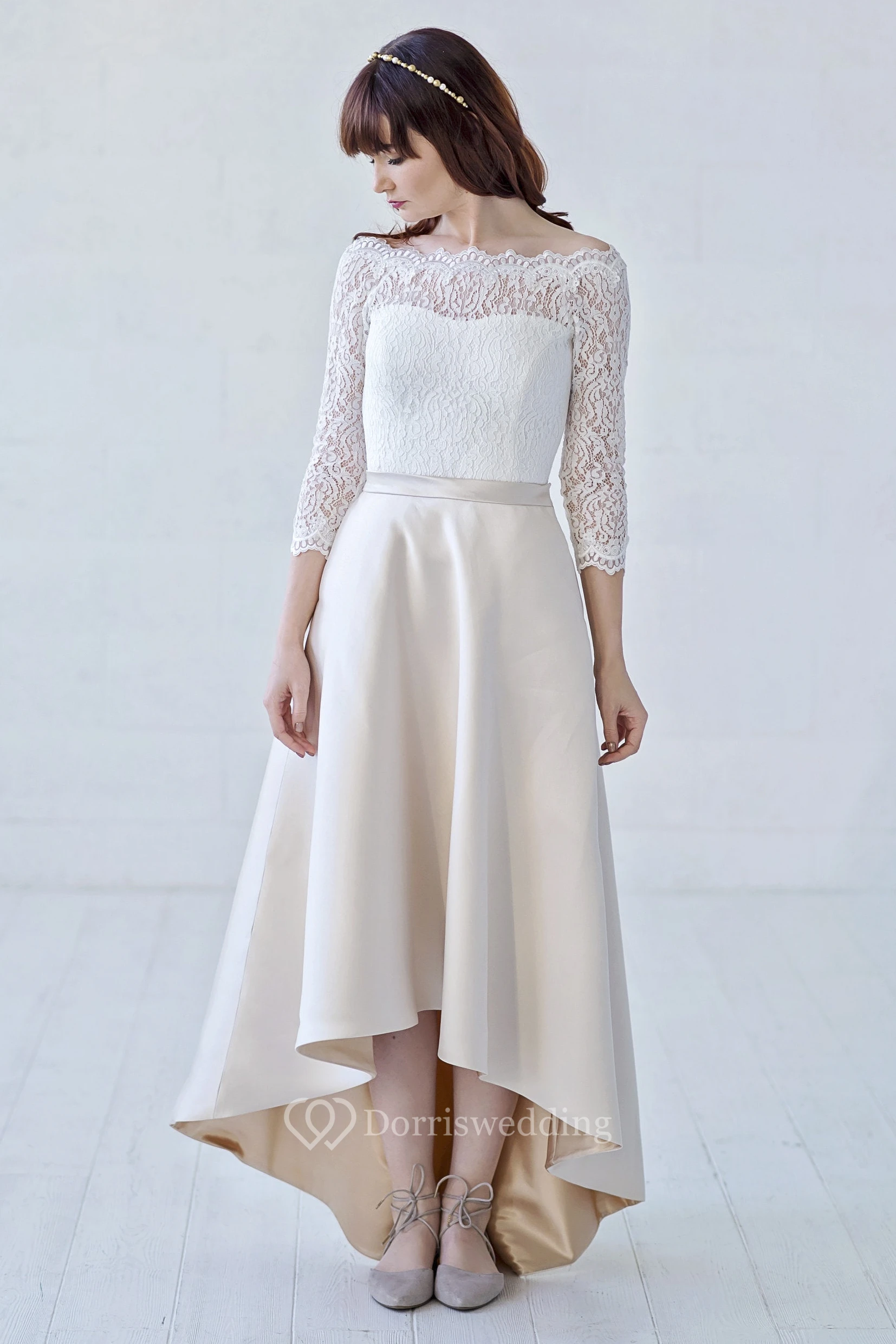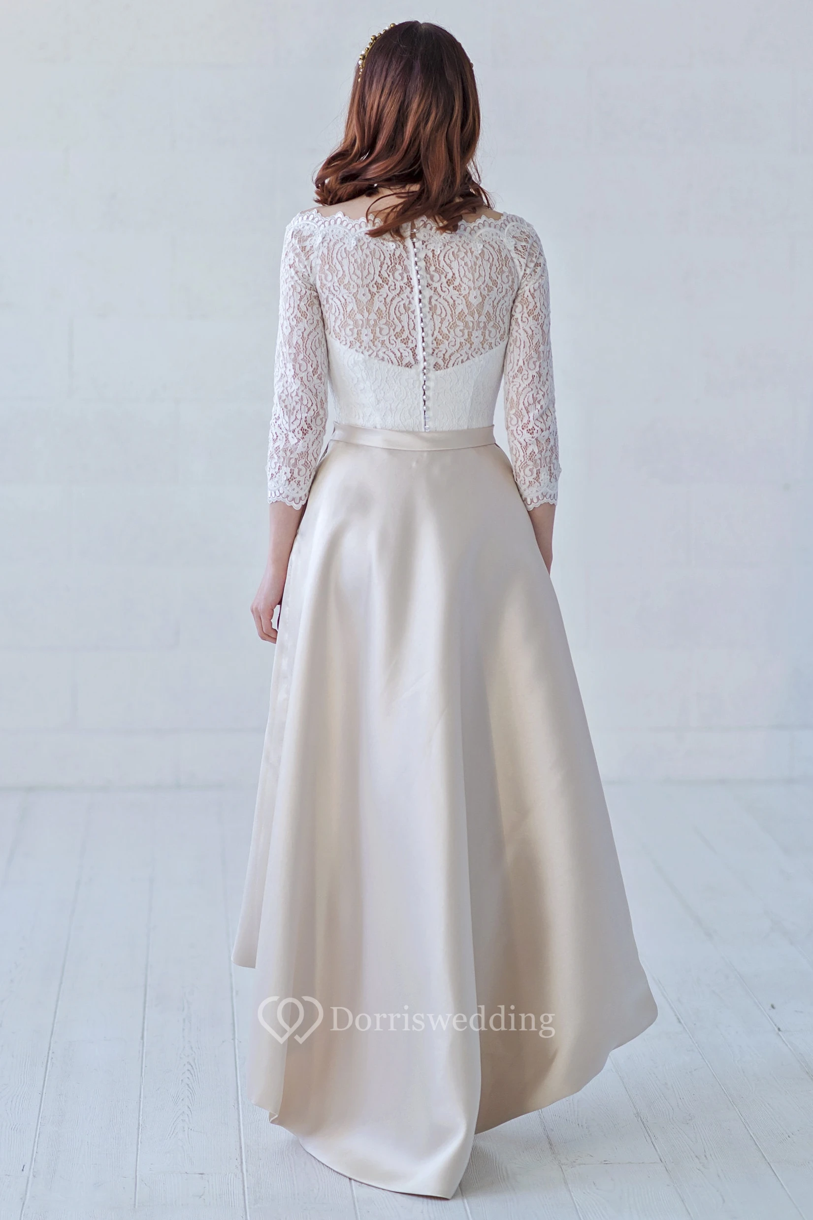 3/4 Illusion Sleeve High-low Off-the-shoulder Lace And Satin With Button Back Wedding Dress