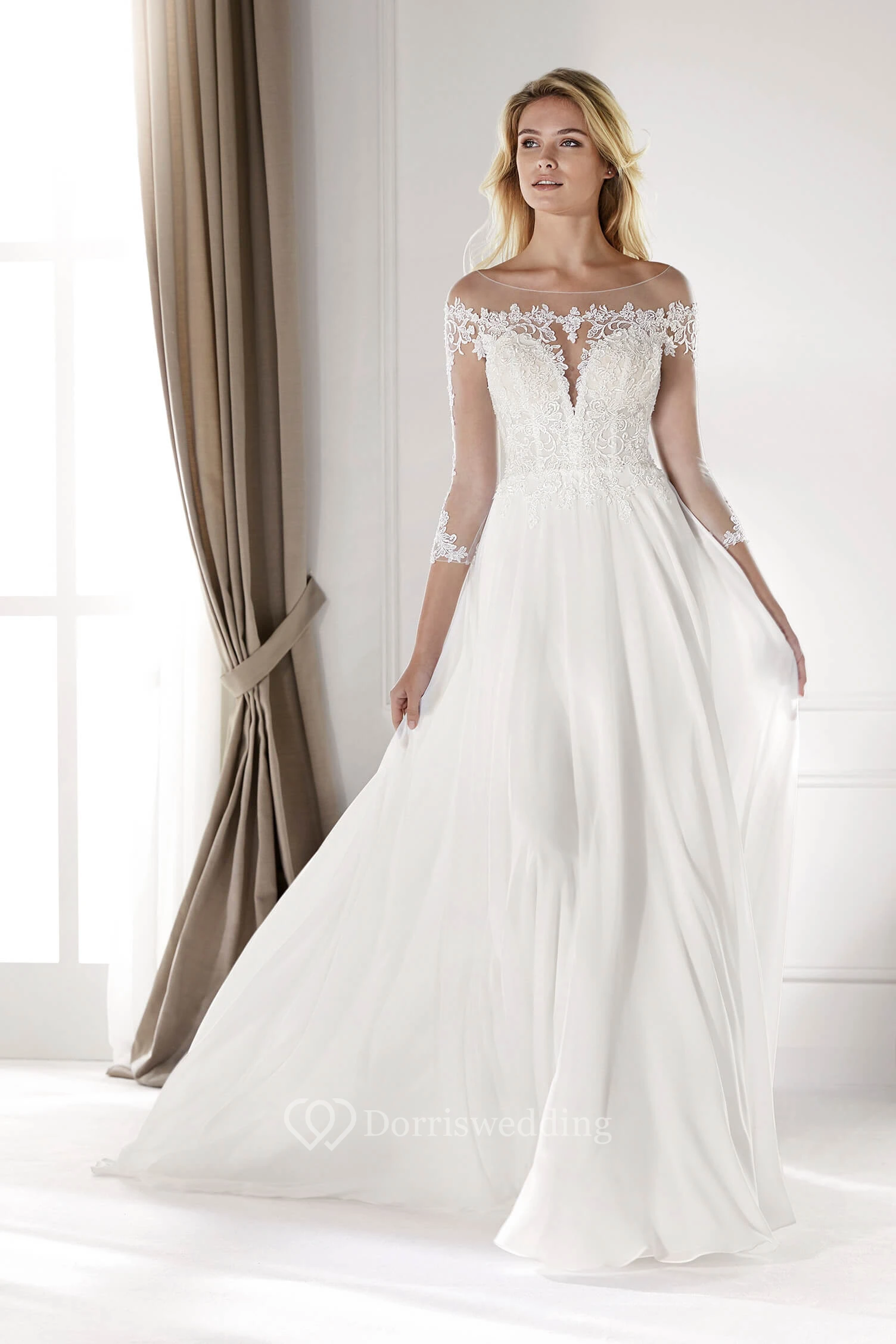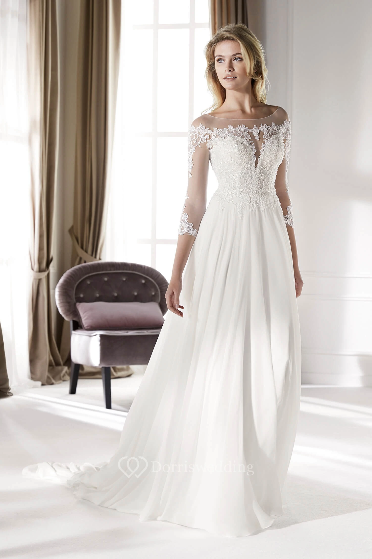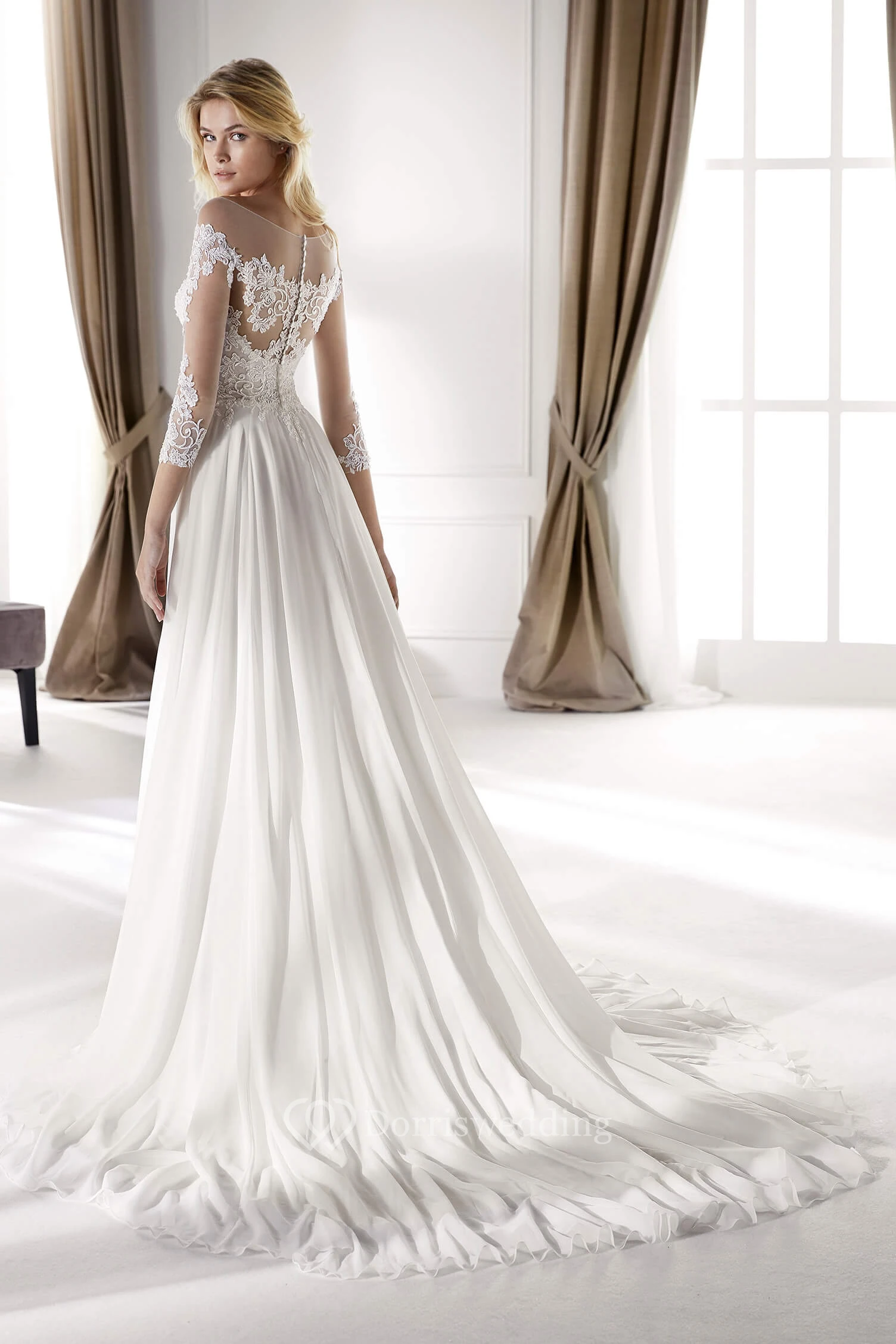 3/4 Sleeves Ethereal Illusion Lace Chiffon Court Train Bridal Elegance Gown