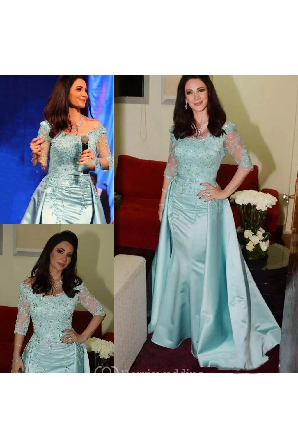 3-4 Length Sleeve Illusion Satin Lace Sexy Bodycon Scoop Luxury Women Floor-length Appliques Evening Dress
