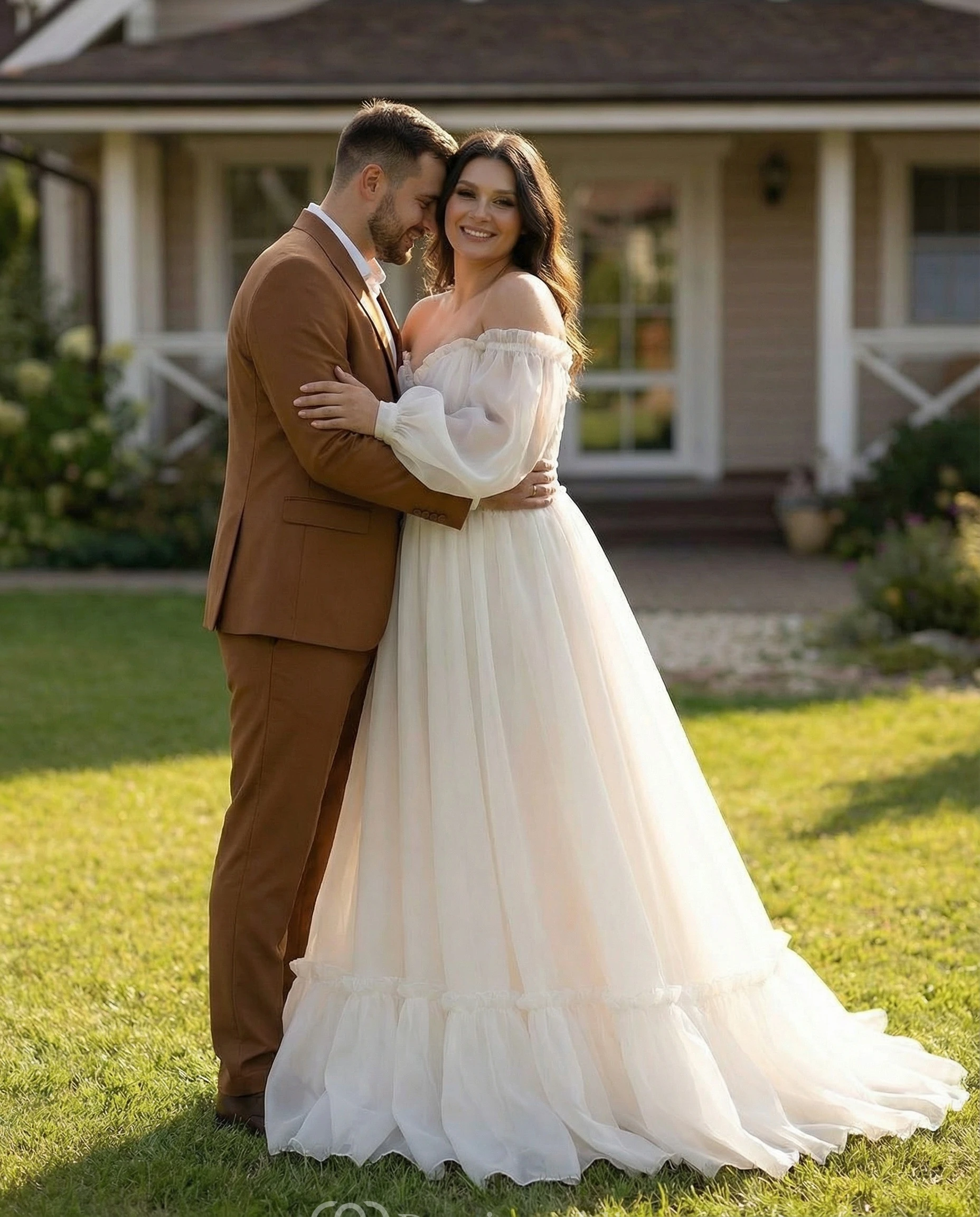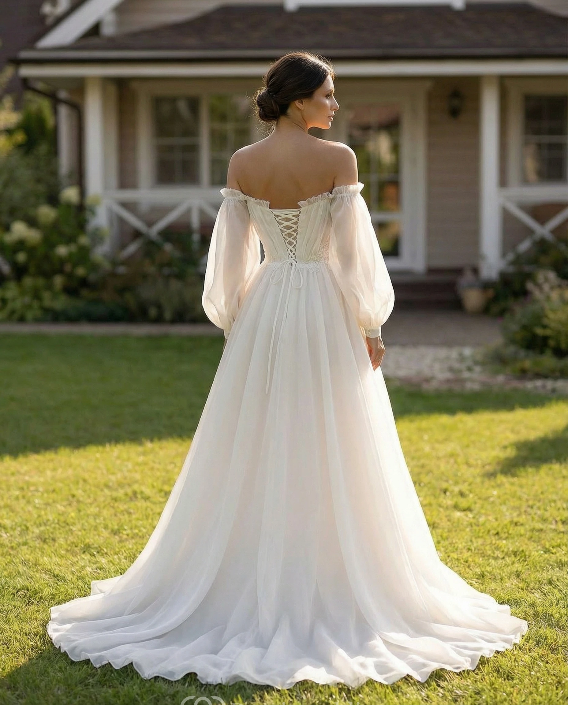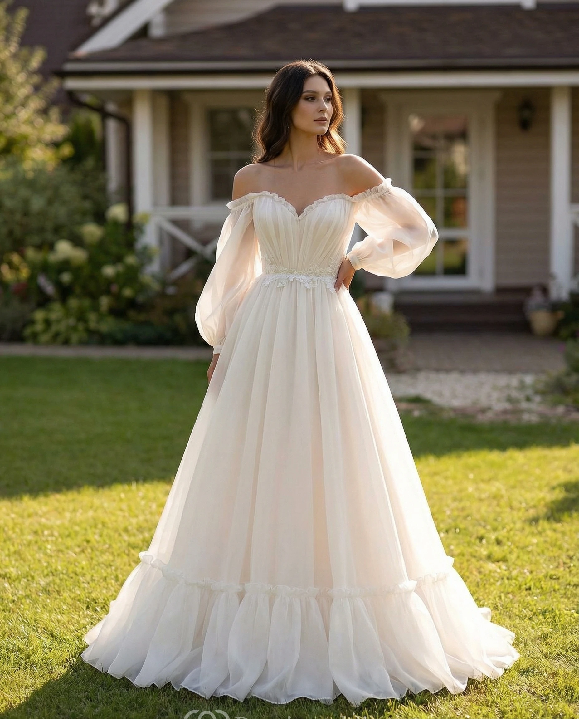 3/4 Off-Shoulder Sleeve Chiffon Wedding Dress