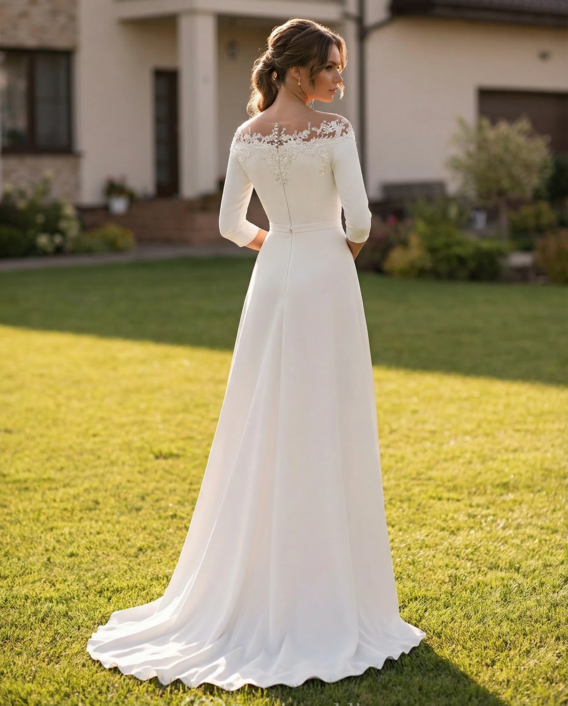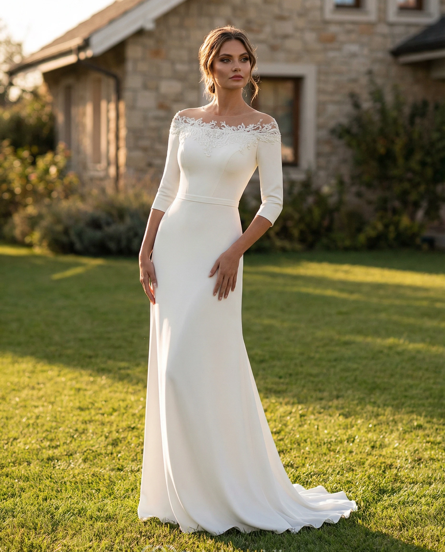 3/4 Sleeve Sheath Wedding Dress with Appliques