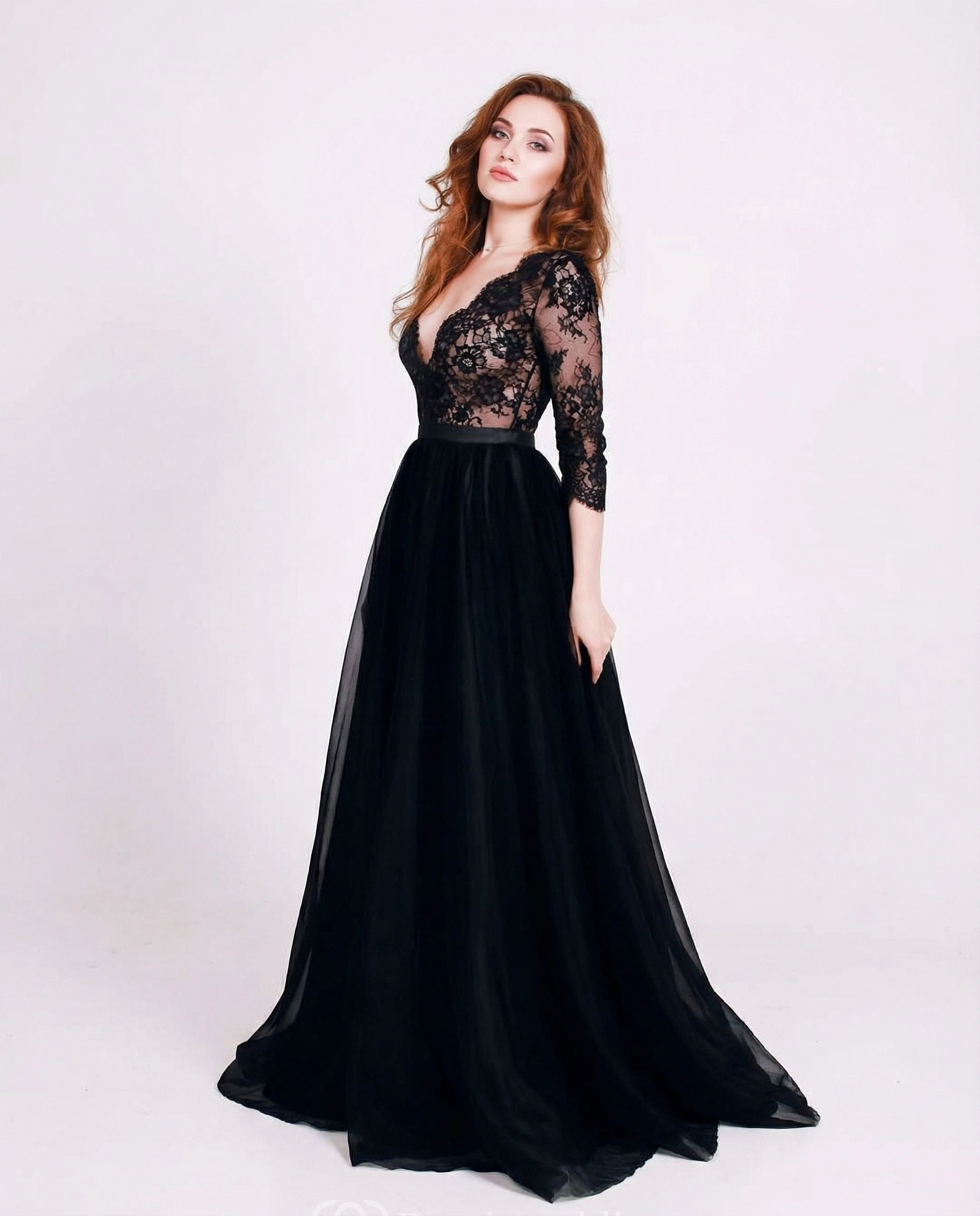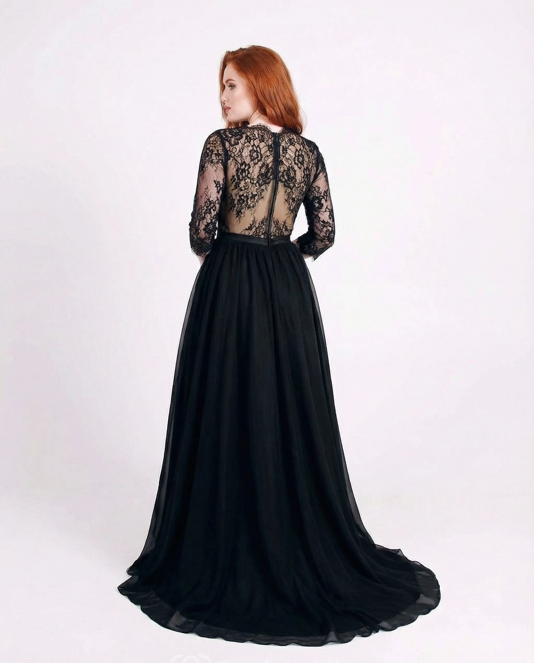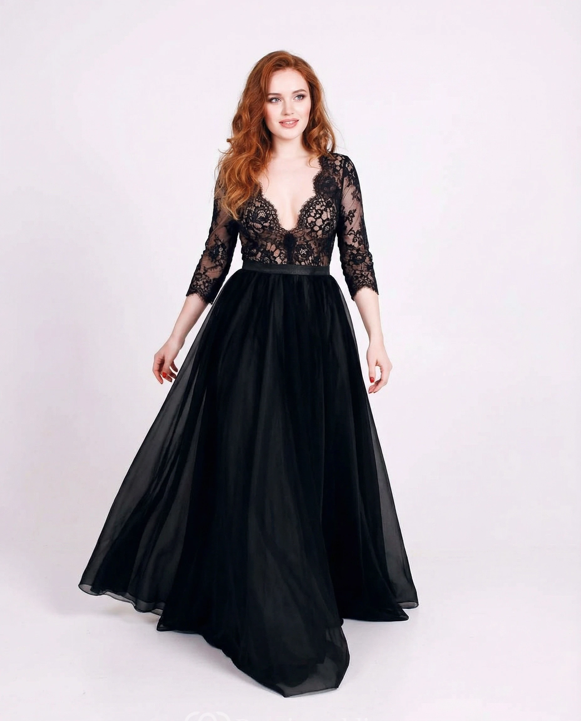 3/4 Sleeve V-Neck Black Lace Applique Dress