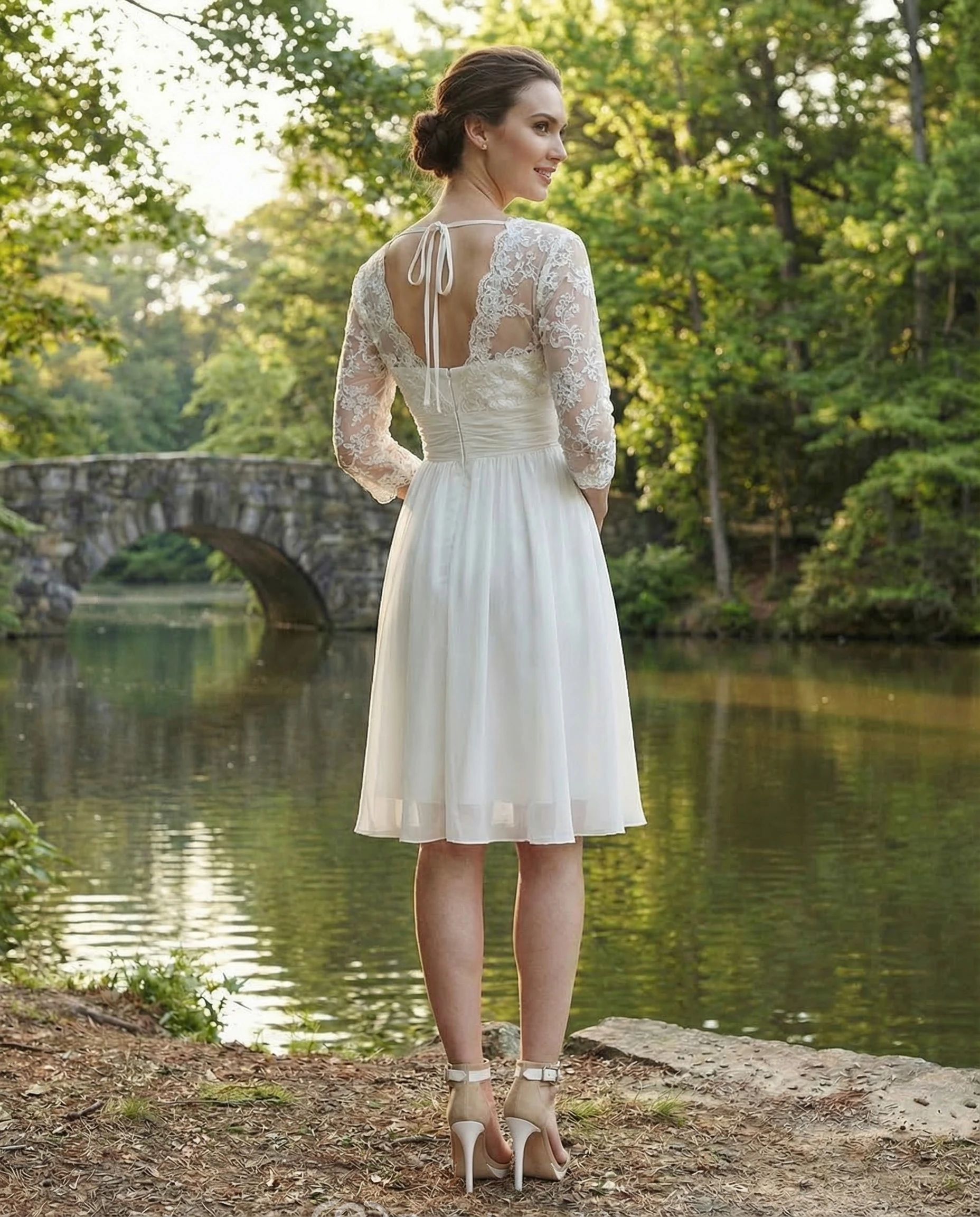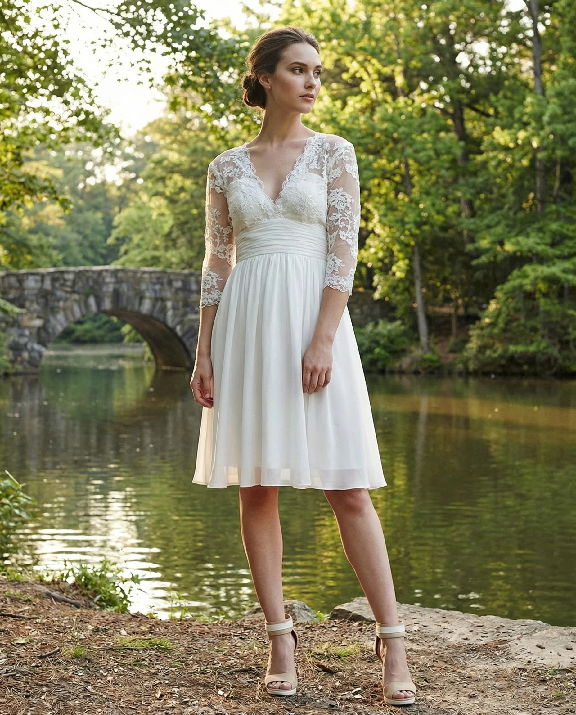 3/4 Sleeve V-Neck Lace Knee-Length Gown