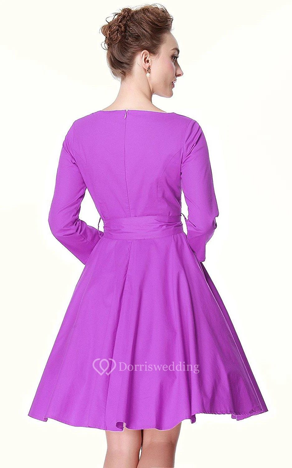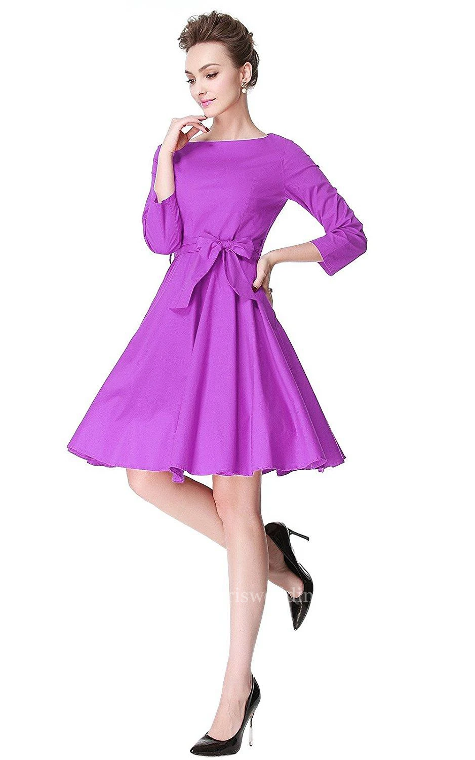 3-4 Sleeved A-line Dress with Pleats and Bow