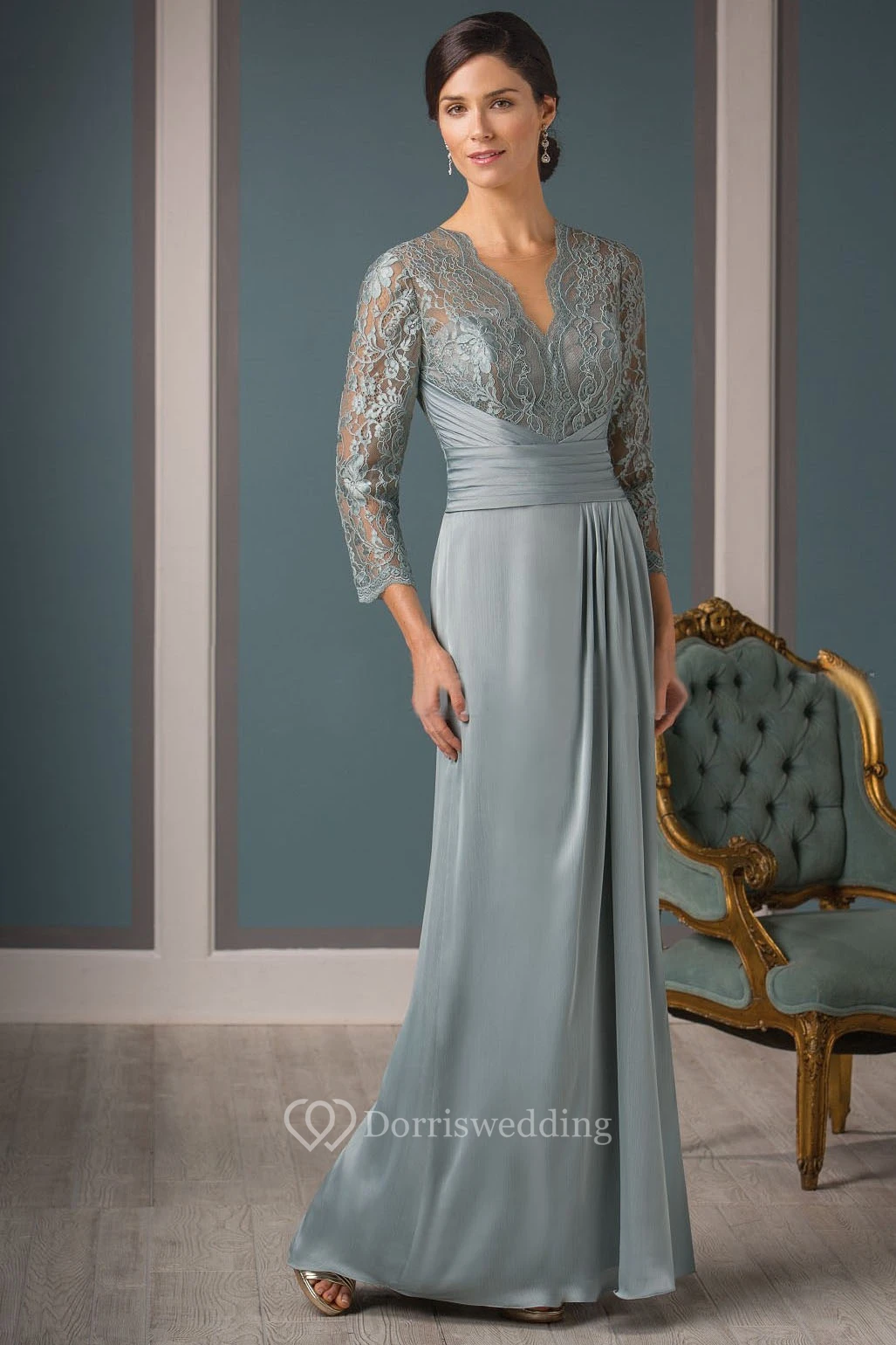 3-4 Sleeved Long Mother Of The Bride Dress With Pleats And V-Back