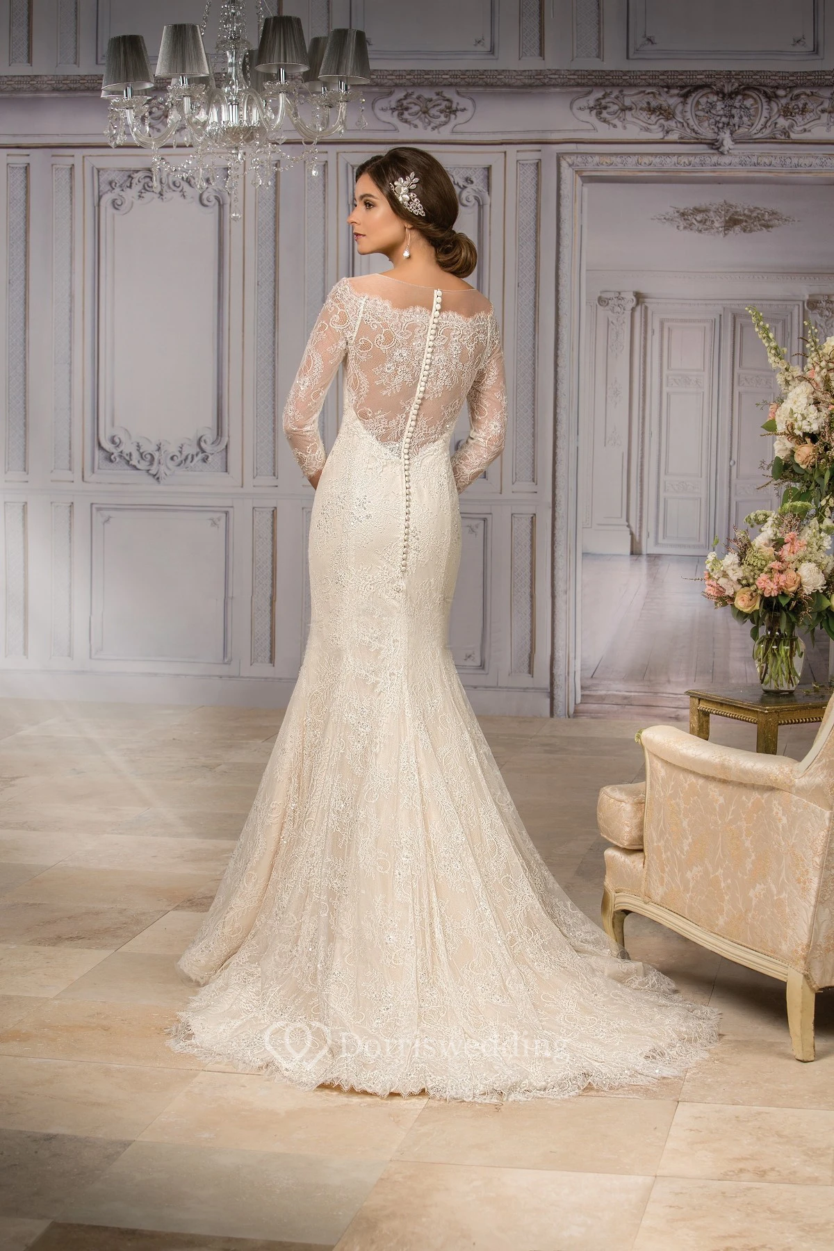 3-4 Sleeved Mermaid Wedding Gown With Appliques And Illusion Back