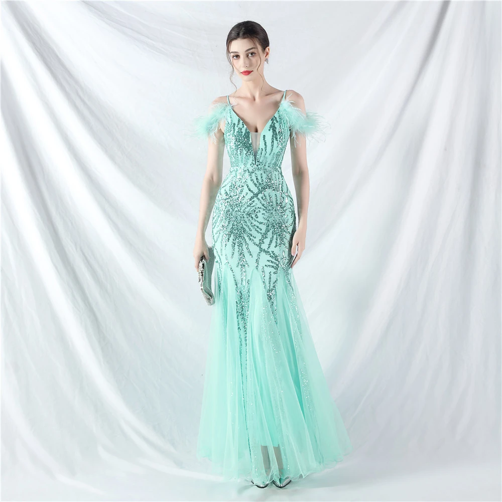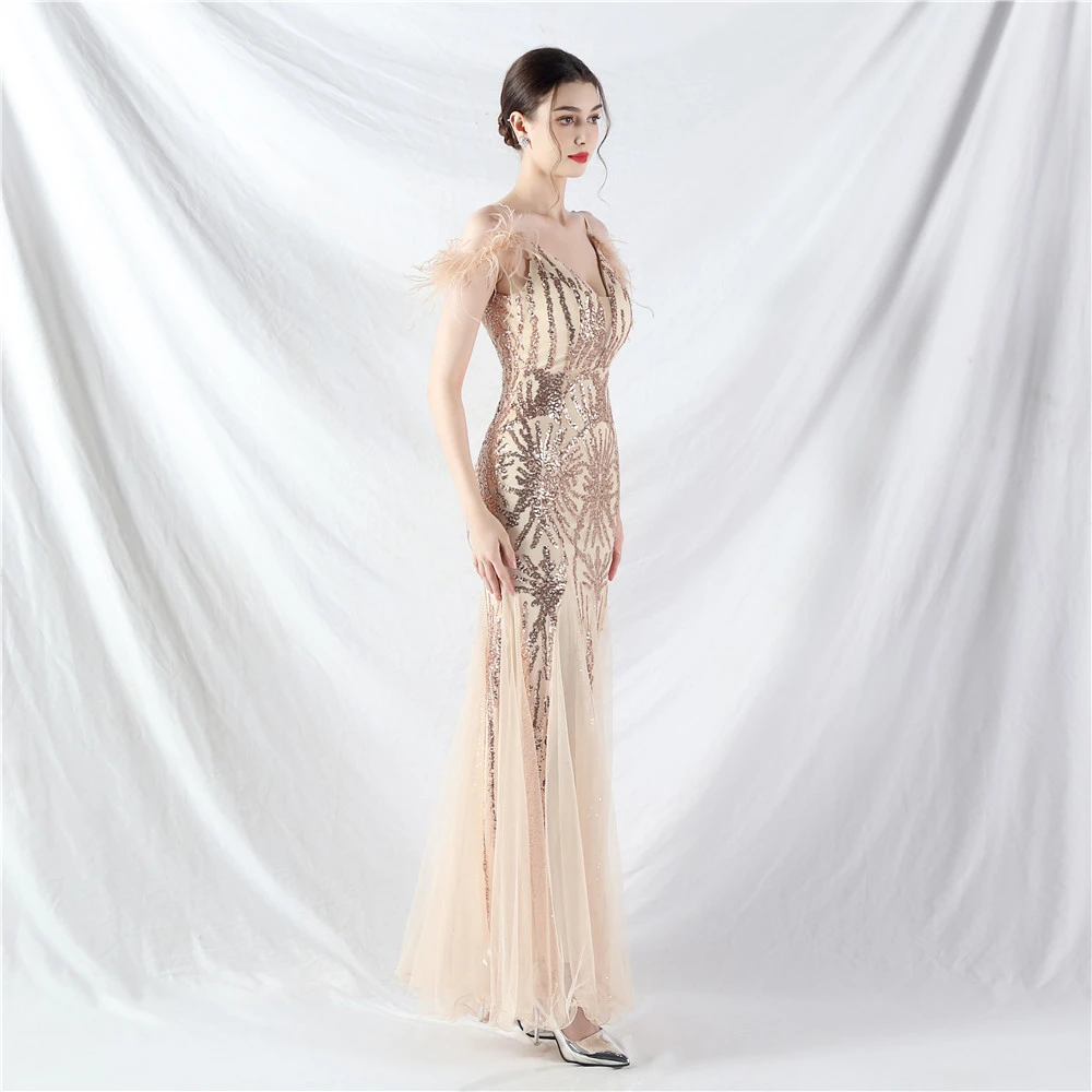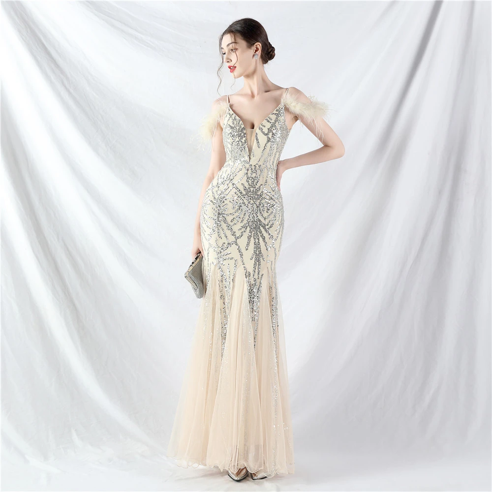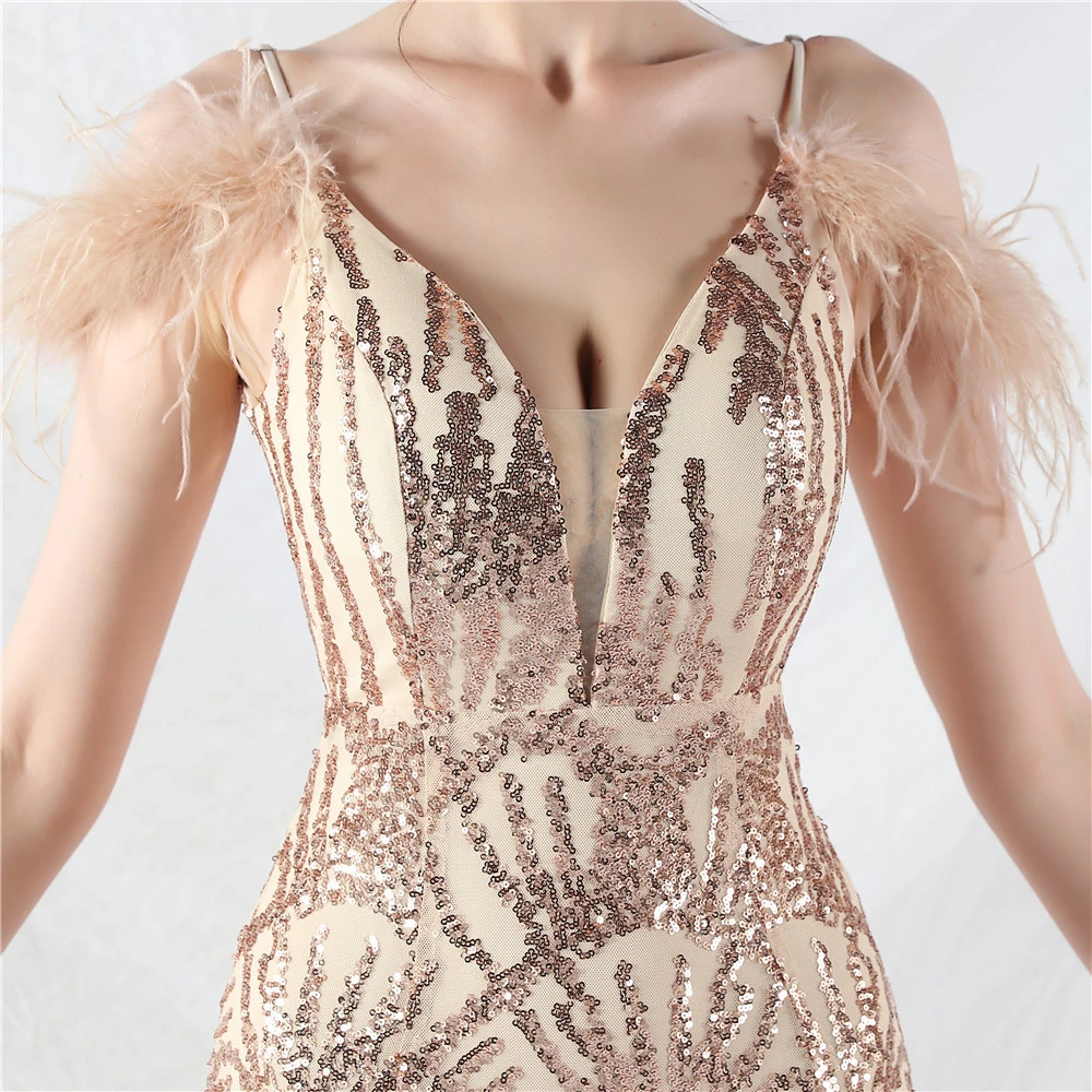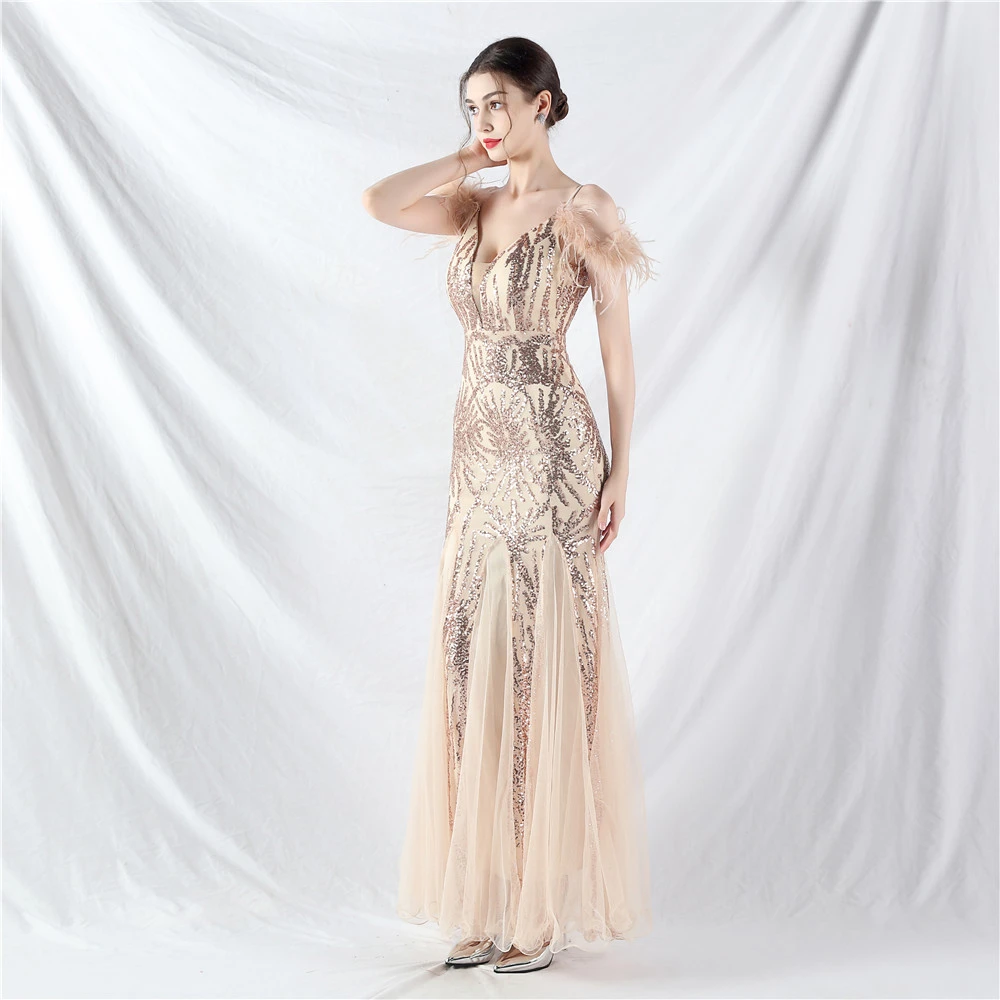 9-Color Craft-Made Camel Bird Feather Mesh Sequin Sexy Suspender Evening Dress