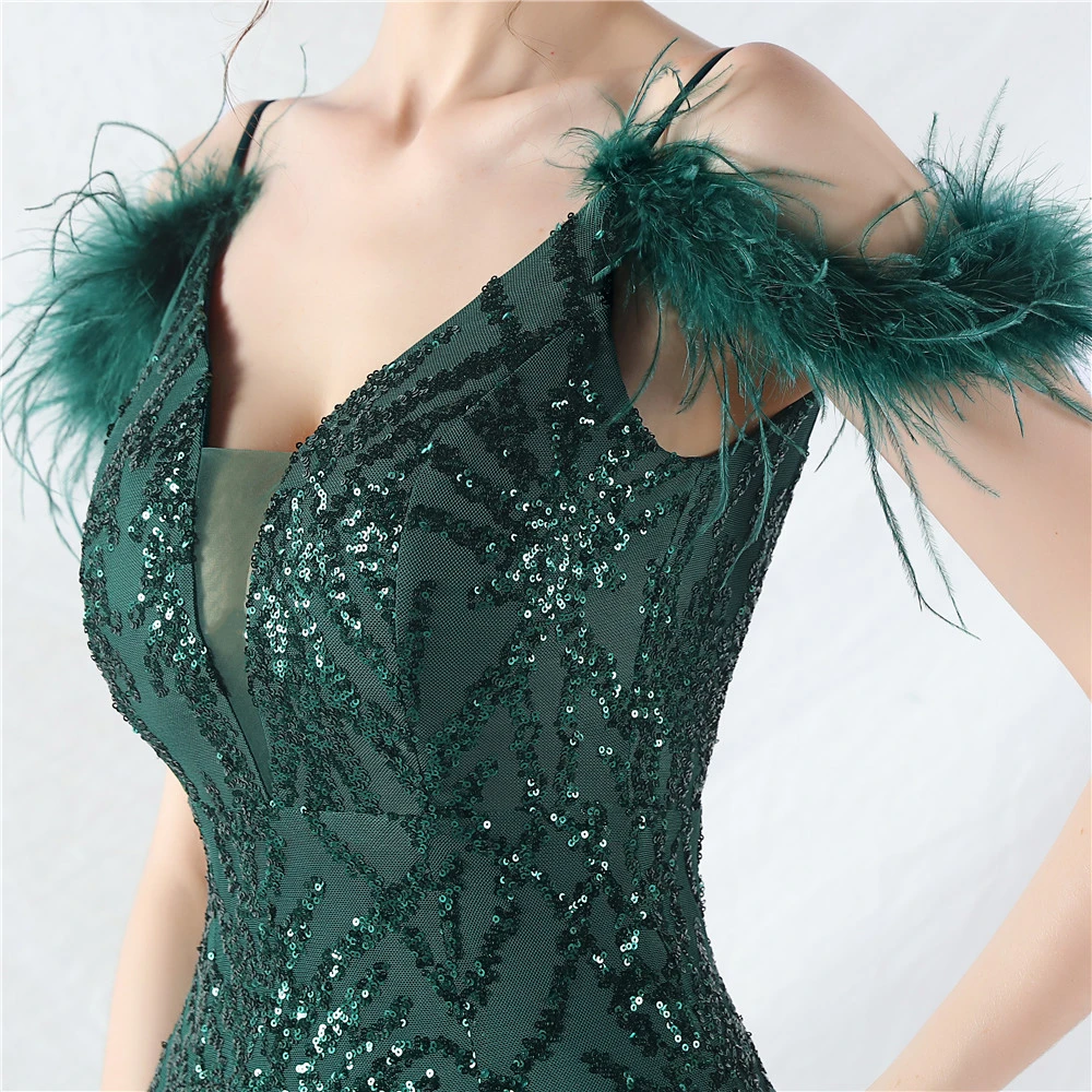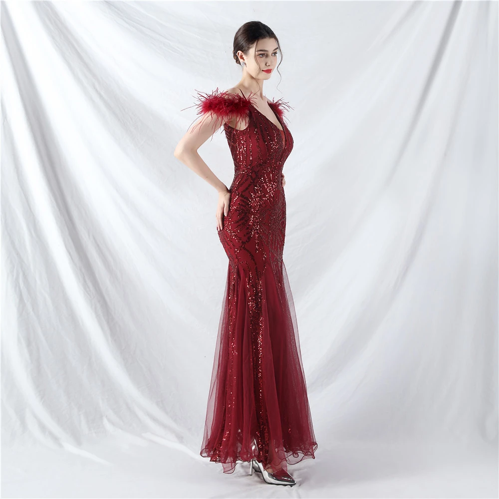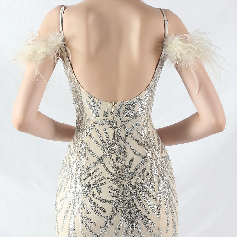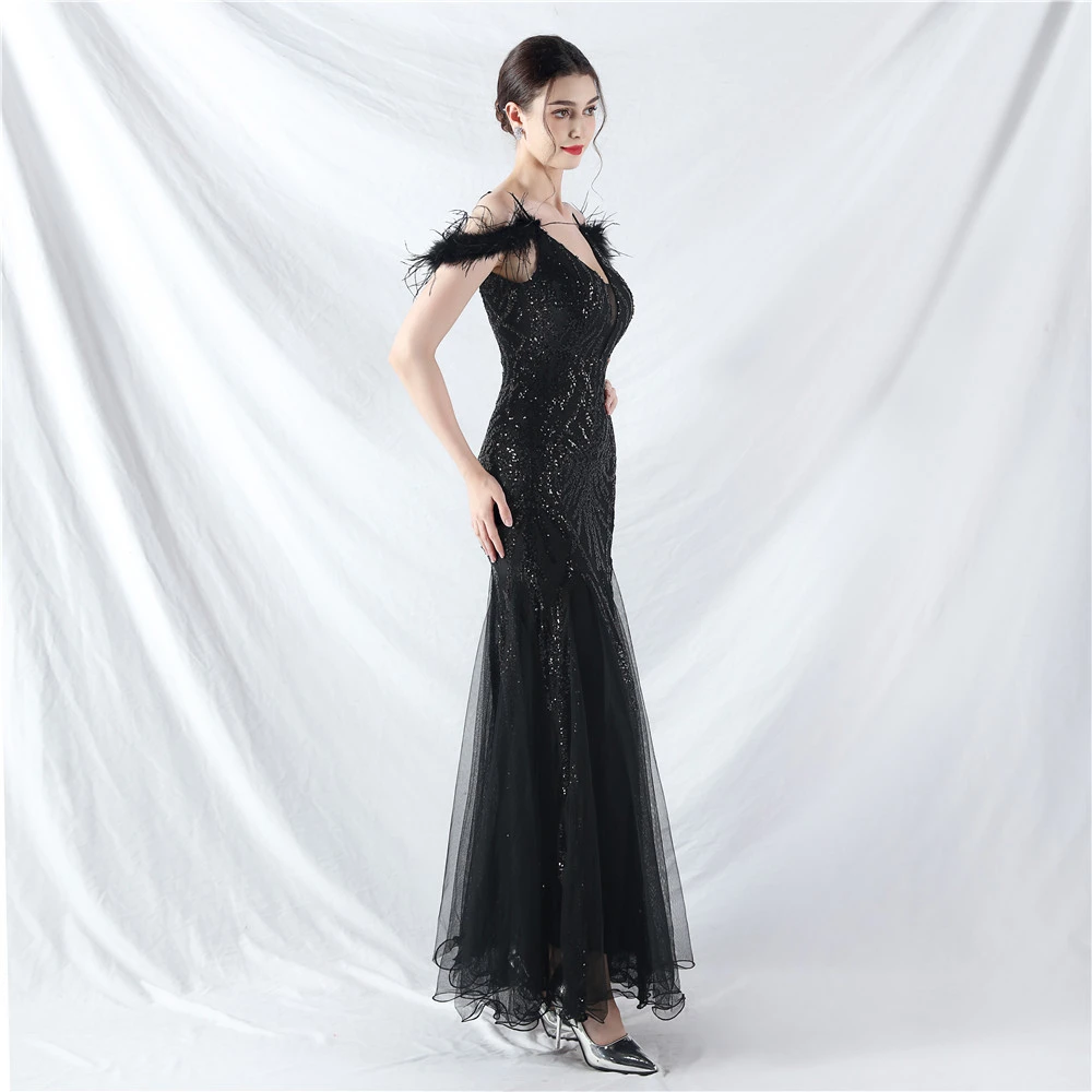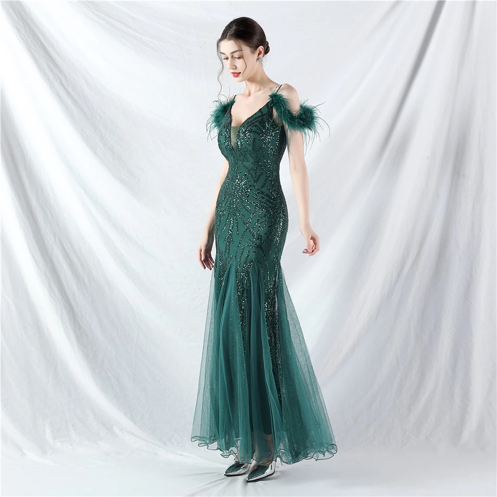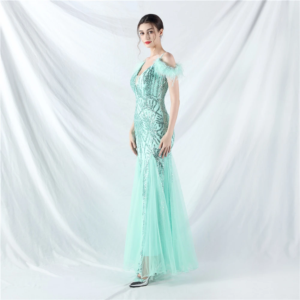 9-Color Craft-Made Camel Bird Feather Mesh Sequin Sexy Suspender Evening Dress