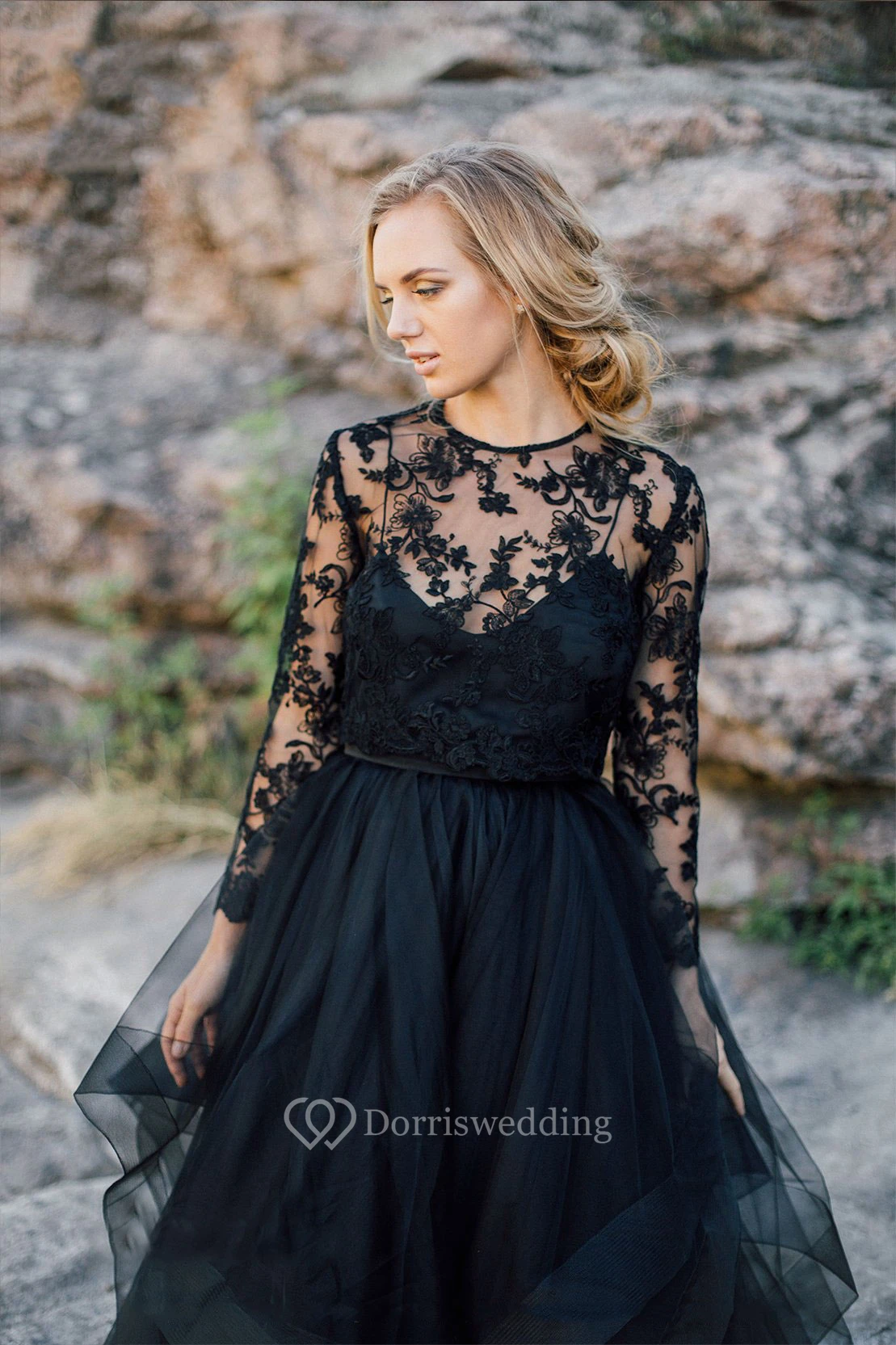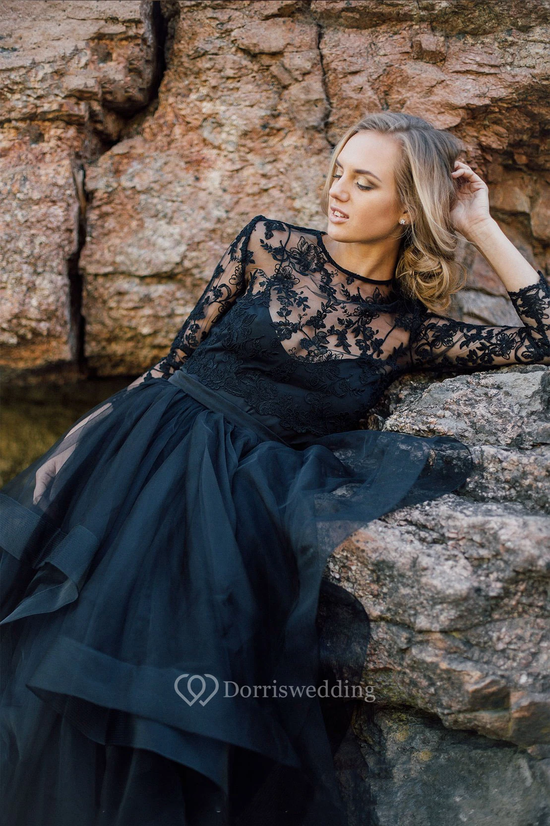 A-Line Black Tea Length Wedding Dress Scoop Long Sleeve Button Illusion Back With Appliques Lace Pleats Sash/Ribbon