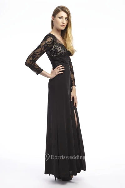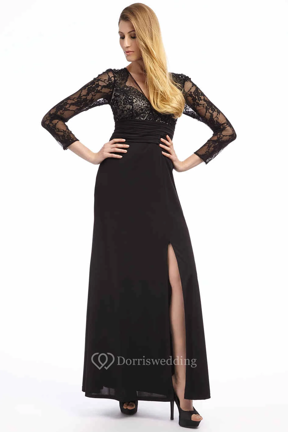 A-Line 3-4-Sleeve Ankle-Length V-Neck Appliqued Chiffon Prom Dress With Beading And Split Front