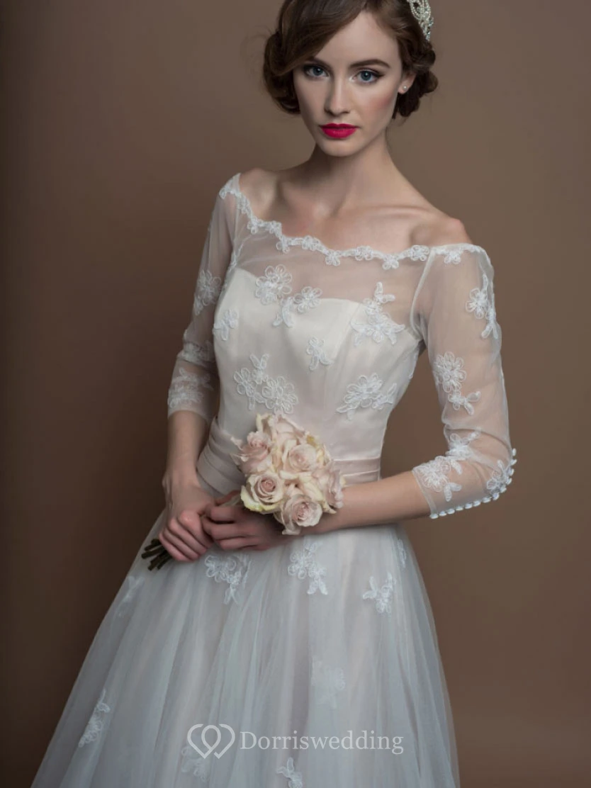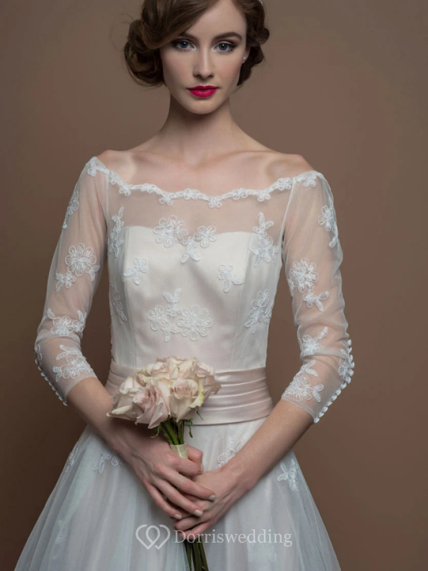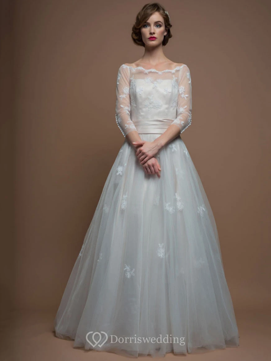 A-Line 3-4-Sleeve Appliqued Floor-Length Bateau-Neck Tulle Wedding Dress