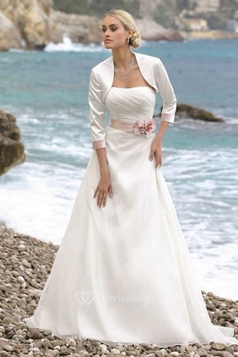 A-Line 3-4-Sleeve Draped Long Strapless Tulle&Satin Wedding Dress With Flower And Cape