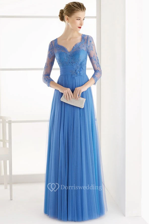 A-Line 3-4-Sleeve Lace V-Neck Floor-Length Tulle Prom Dress With Flower And Pleats