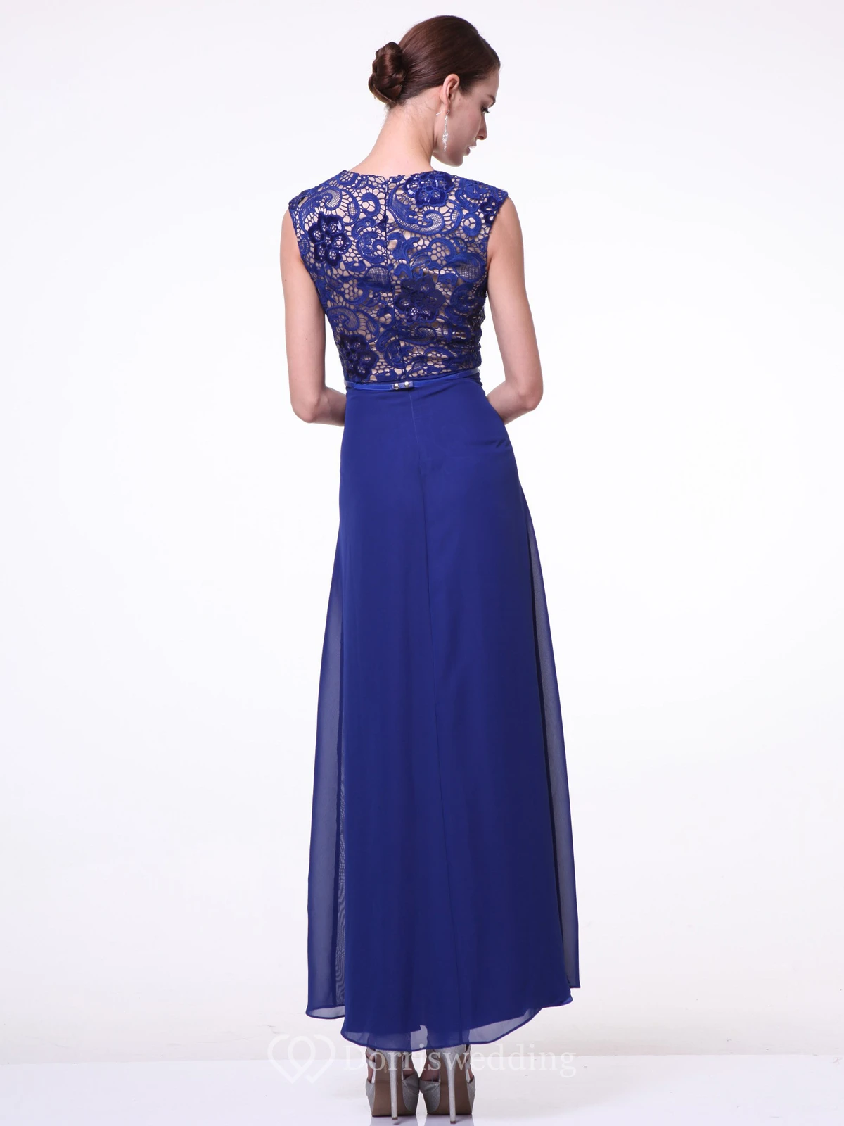 A-Line Ankle-Length V-Neck Sleeveless Chiffon Zipper Dress With Lace
