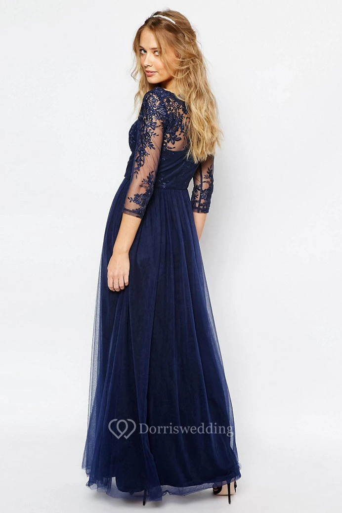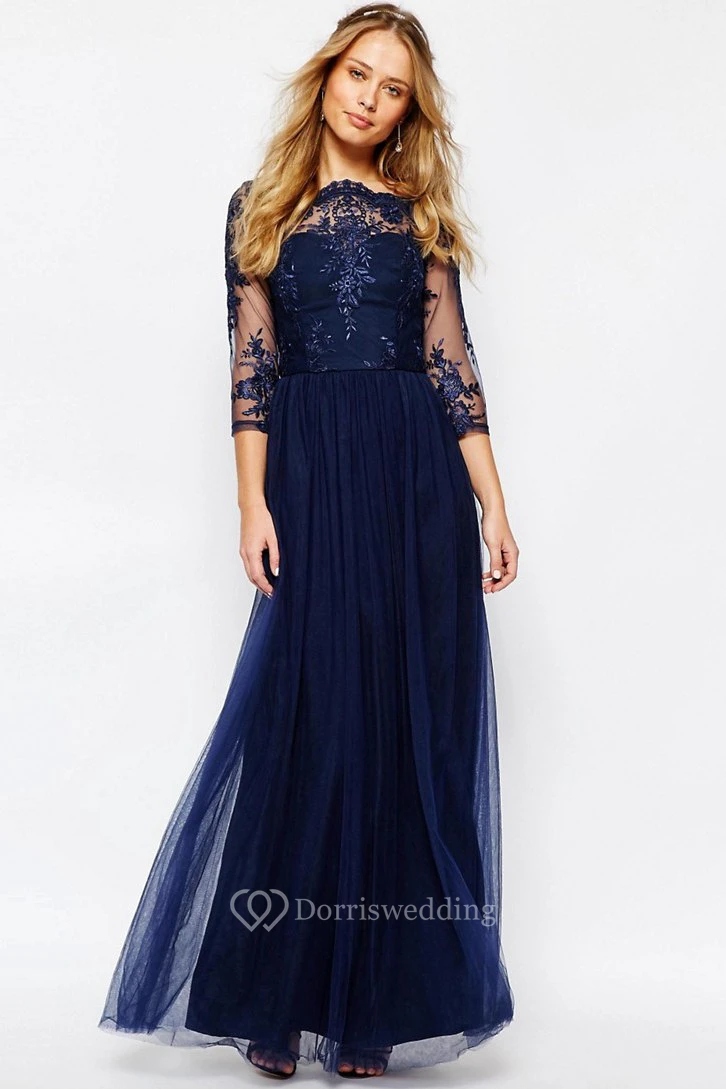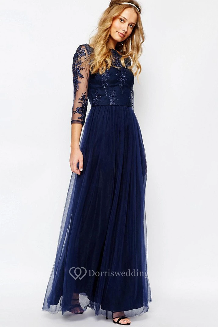 A-Line Appliqued Bateau-Neck 3-4-Sleeve Long Tulle Blue Bridesmaid Dress With Pleats