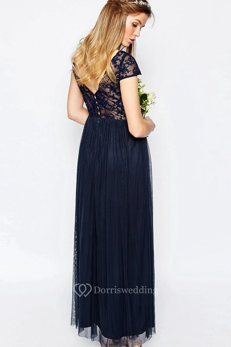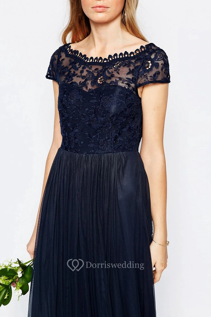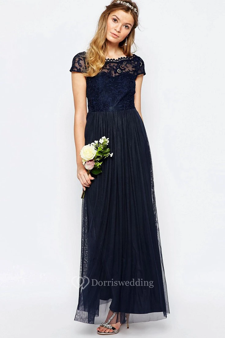 A-Line Appliqued Bateau-Neck Floor-Length Short-Sleeve Chiffon Bridesmaid Dress With Pleats