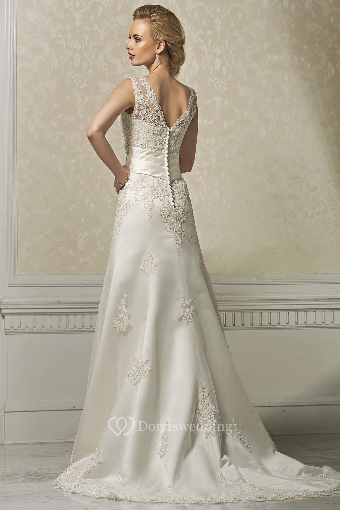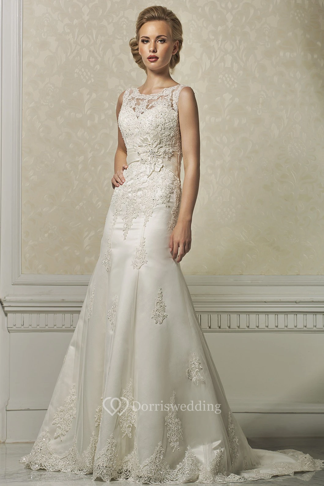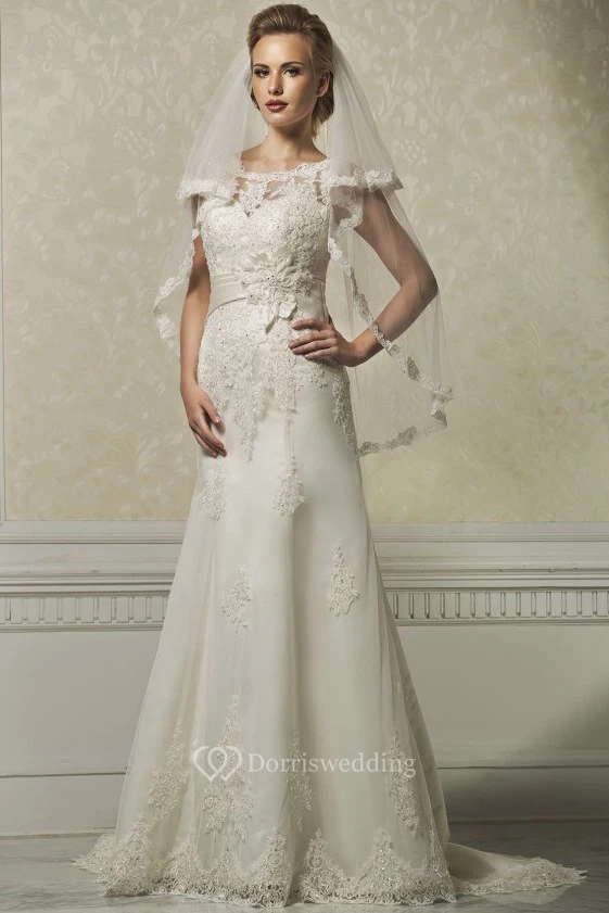 A-Line Appliqued Bateau-Neck Floor-Length Sleeveless Lace Wedding Dress