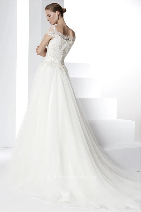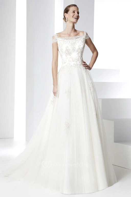 A-Line Appliqued Cap Sleeve Bateau Neck Tulle Wedding Dress With Court Train