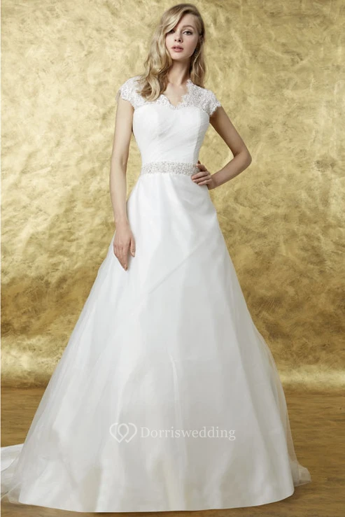 A-Line Appliqued Cap Sleeve Scalloped Organza Wedding Dress