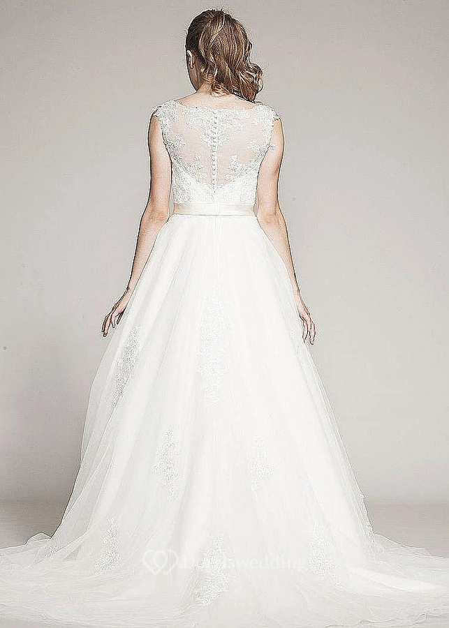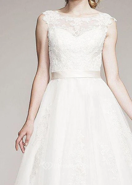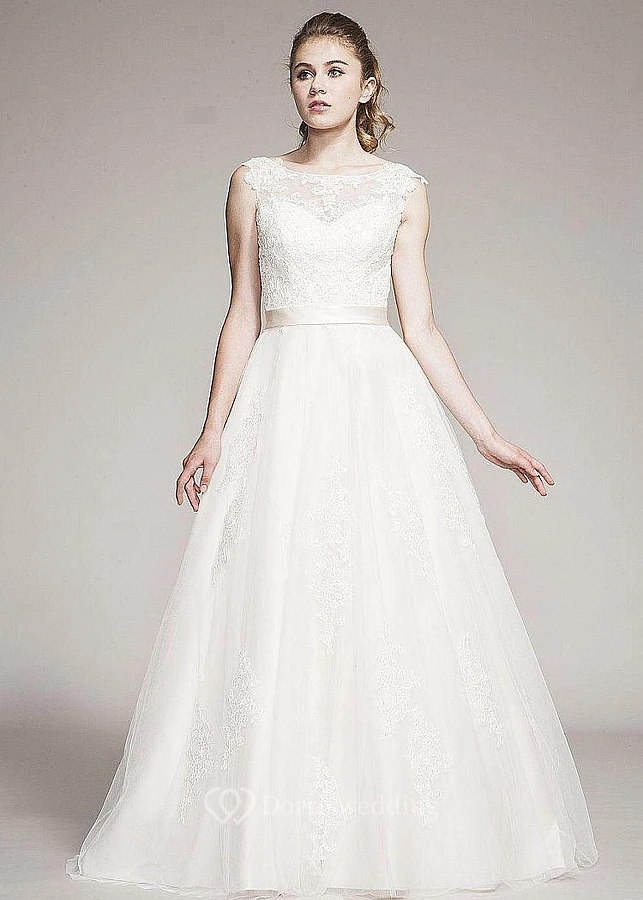 A-Line Appliqued Floor-Length Sleeveless Bateau-Neck Lace Wedding Dress