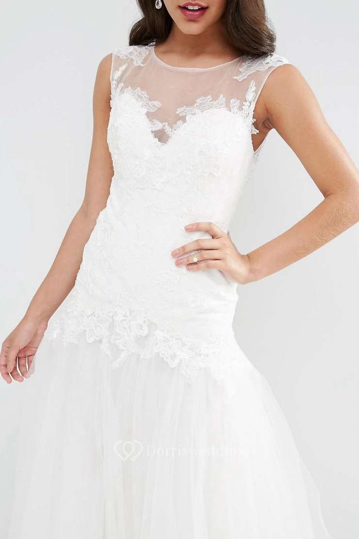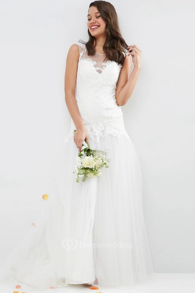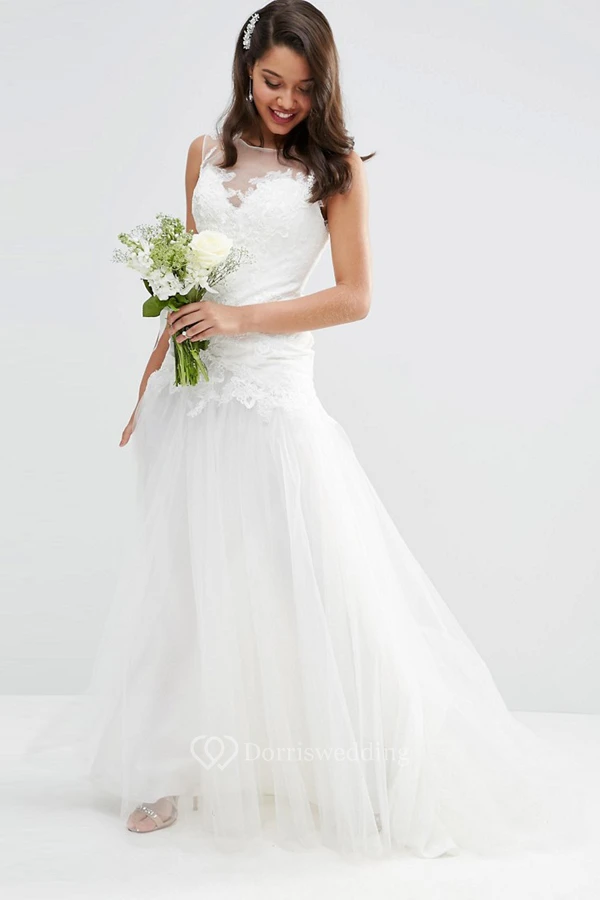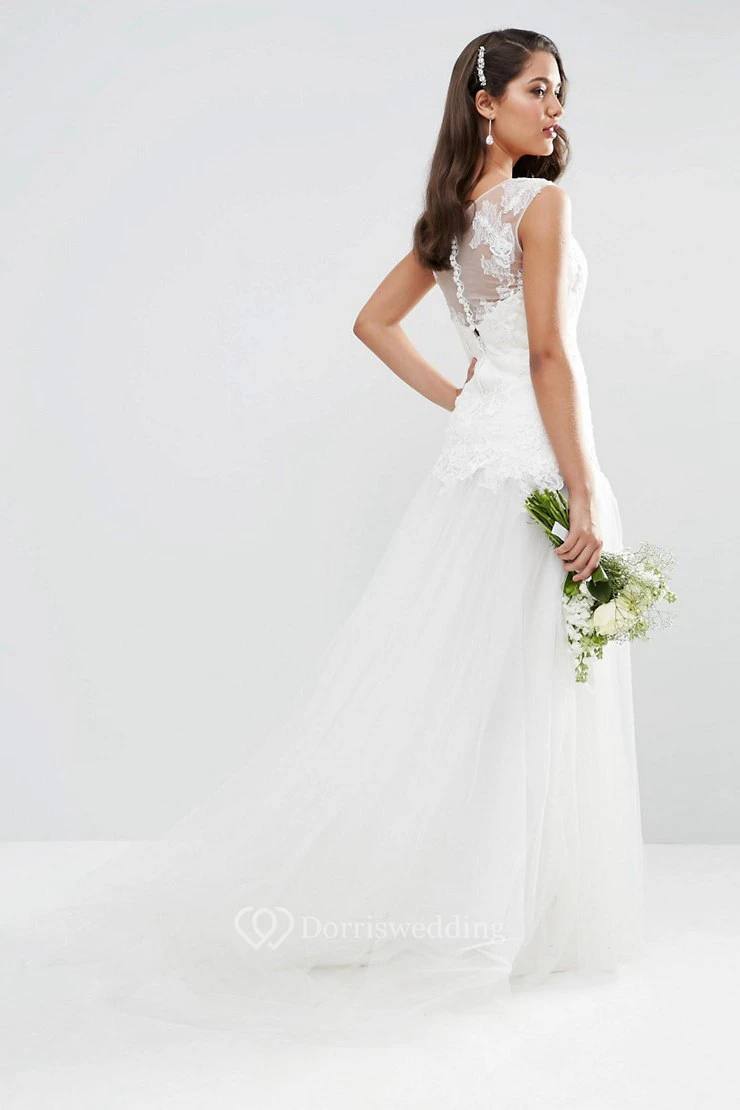 A-Line Appliqued Floor-Length Sleeveless Bateau-Neck Tulle Wedding Dress With Pleats