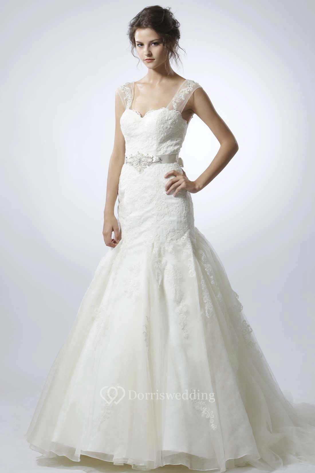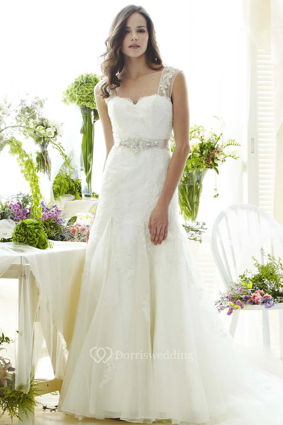 A-Line Appliqued Floor-Length Sleeveless Lace Wedding Dress With Ruffles And Waist Jewellery