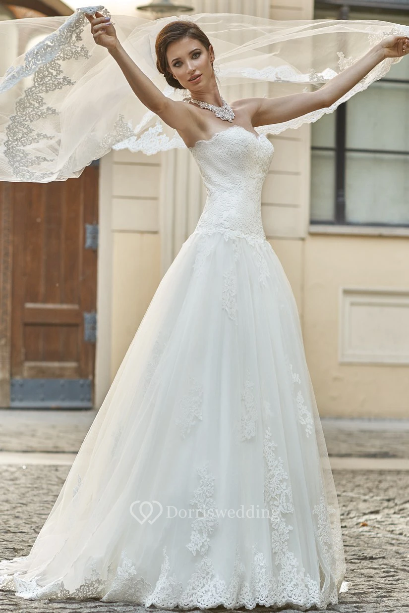 A-Line Appliqued Floor-Length Sleeveless Sweetheart Lace Wedding Dress With Pleats