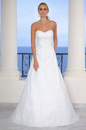 A-Line Appliqued Floor-Length Strapless Organza Wedding Dress With Flower