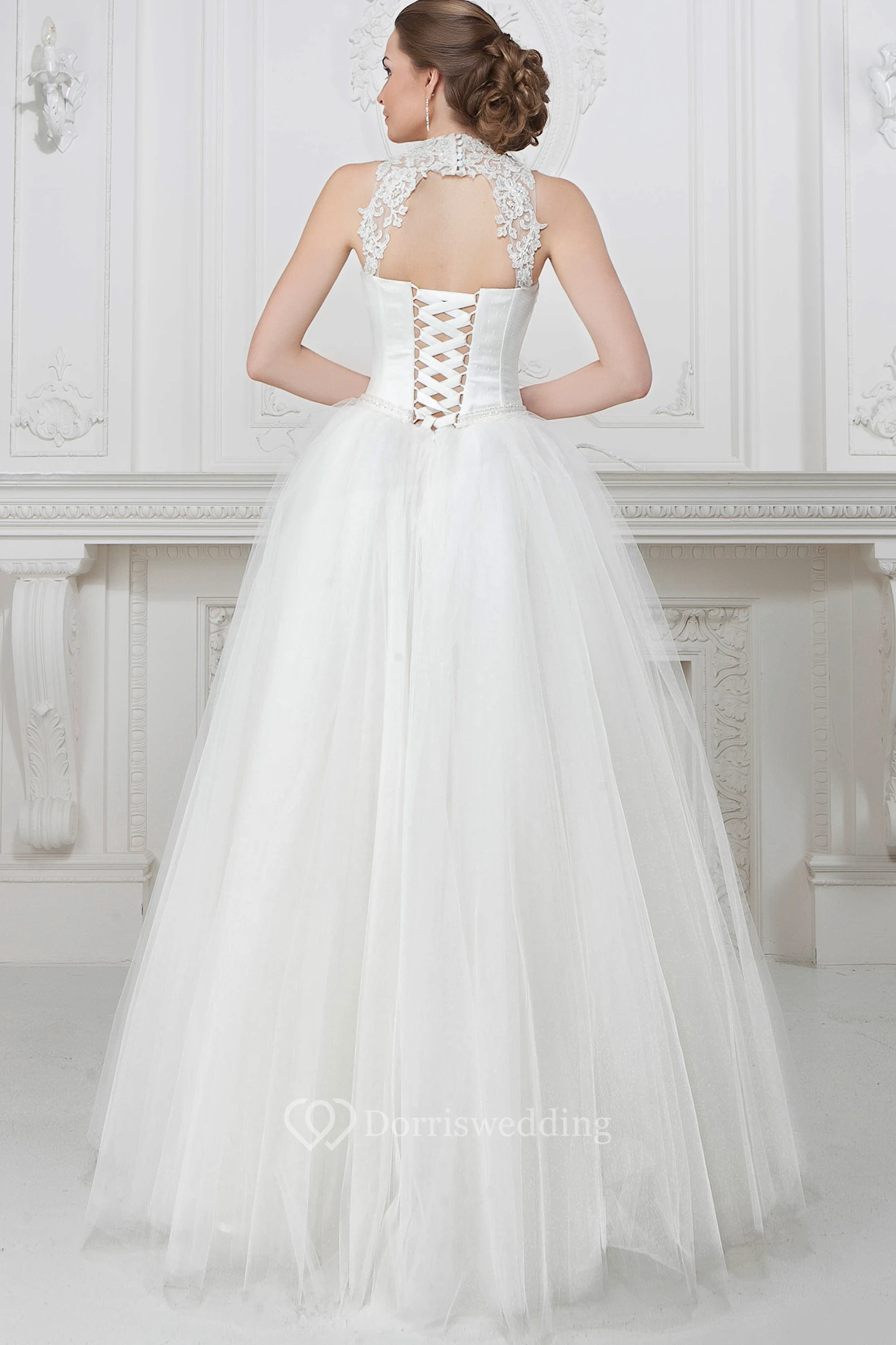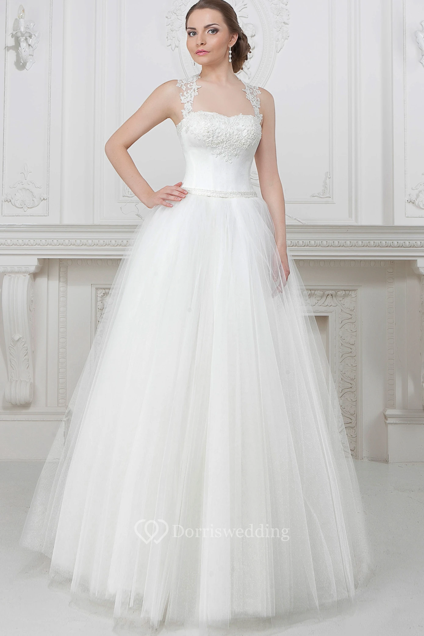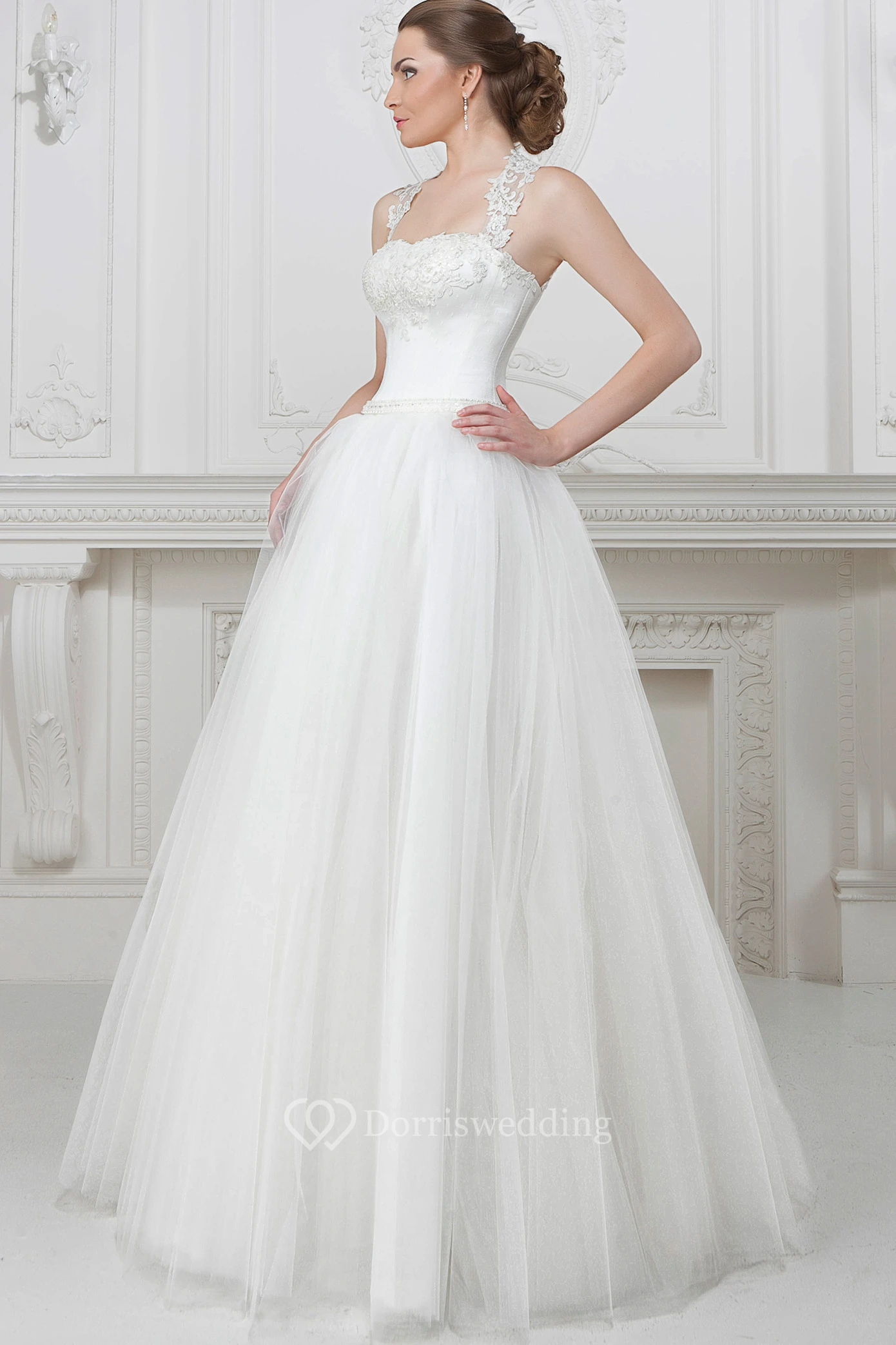 A-Line Appliqued Floor-Length Strapped Sleeveless Tulle Wedding Dress With Pleats