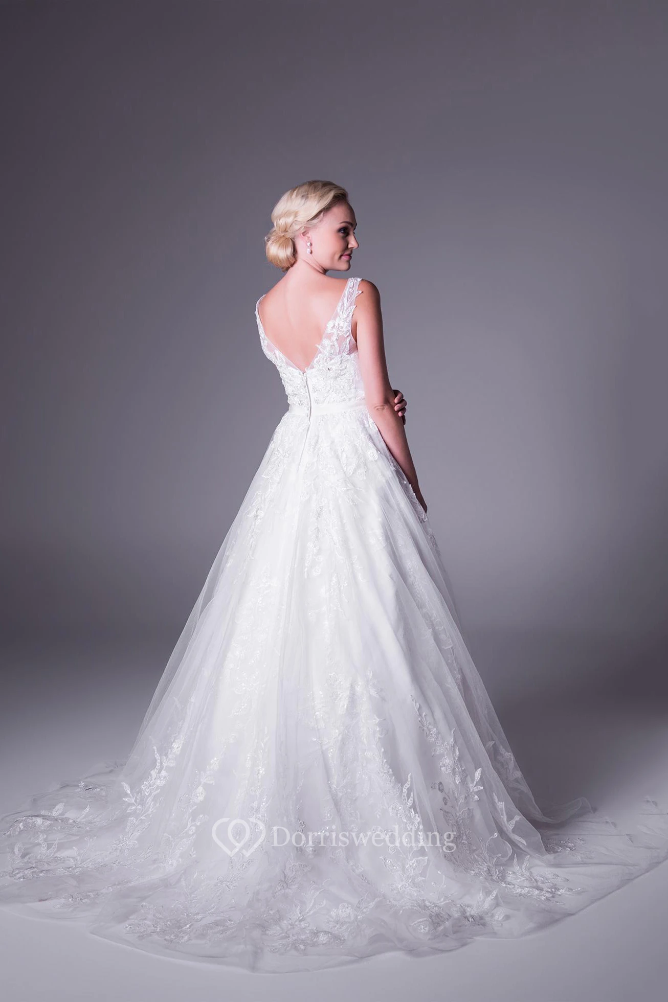 A-Line Appliqued Floor-Length V-Neck Sleeveless Lace Wedding Dress