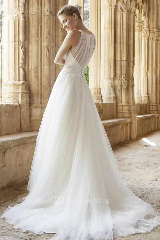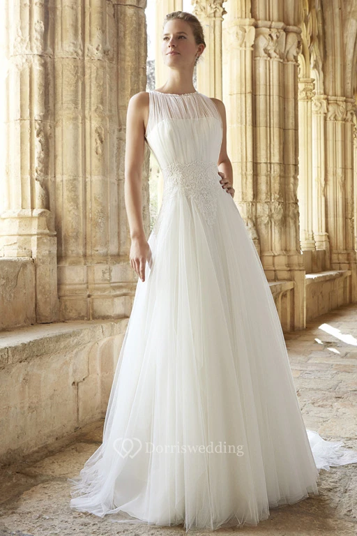 A-Line Appliqued Jewel Long Sleeveless Tulle Wedding Dress With Illusion Back And Ruffles