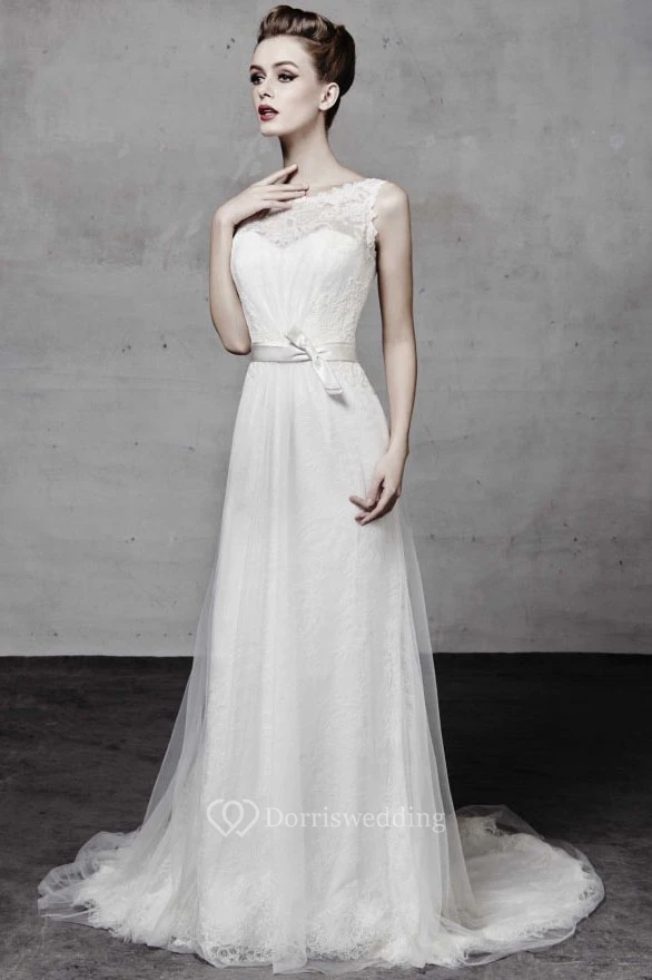A-Line Appliqued Long Sleeveless Bateau Tulle&Lace Wedding Dress With Bow