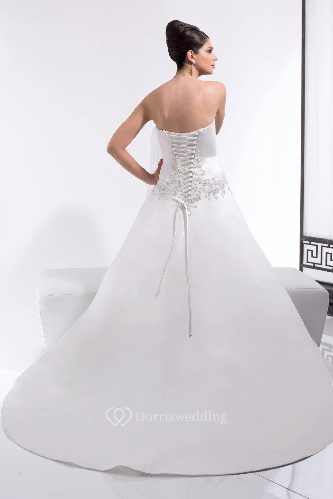 A-Line Appliqued Long Sleeveless Strapless Satin Wedding Dress With Draping And Corset Back