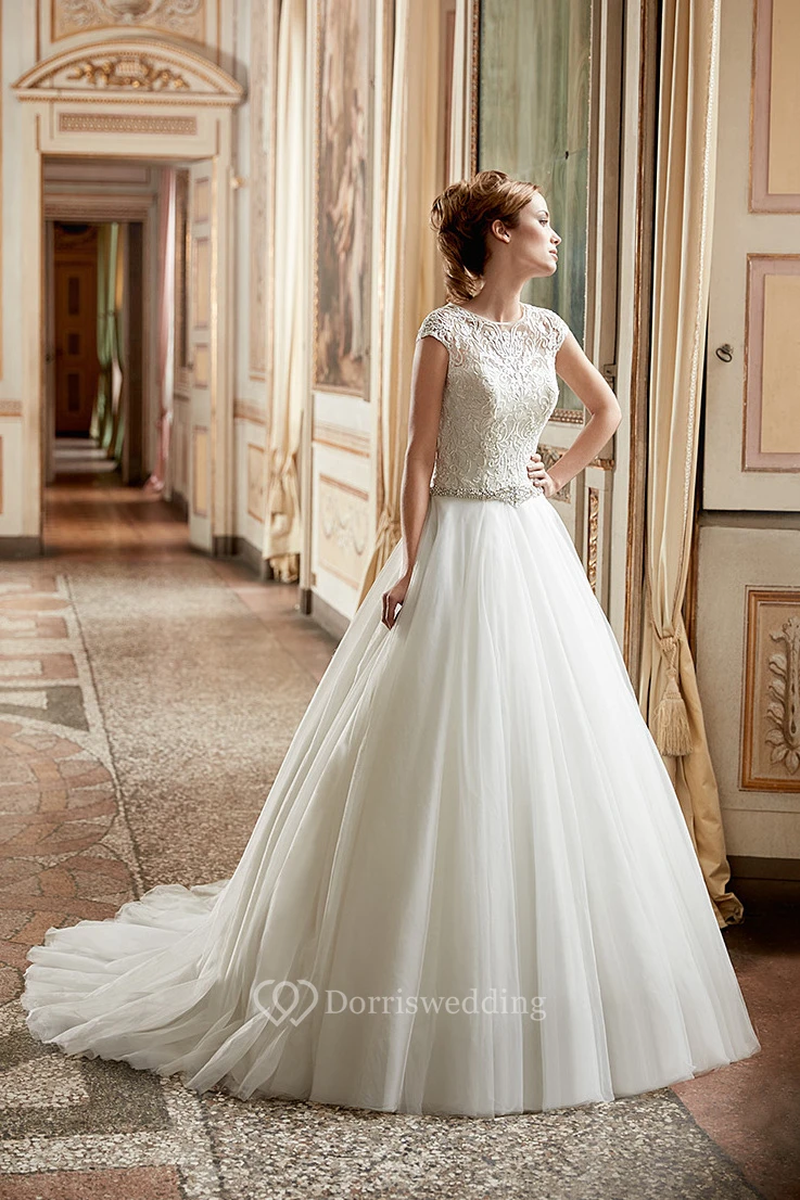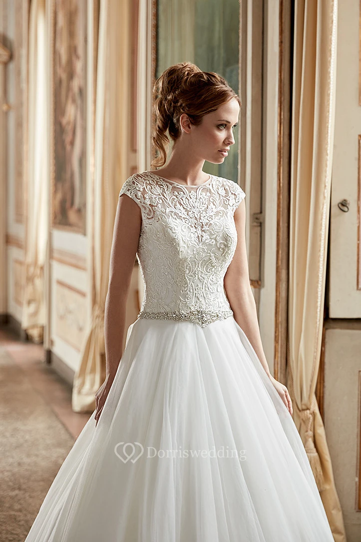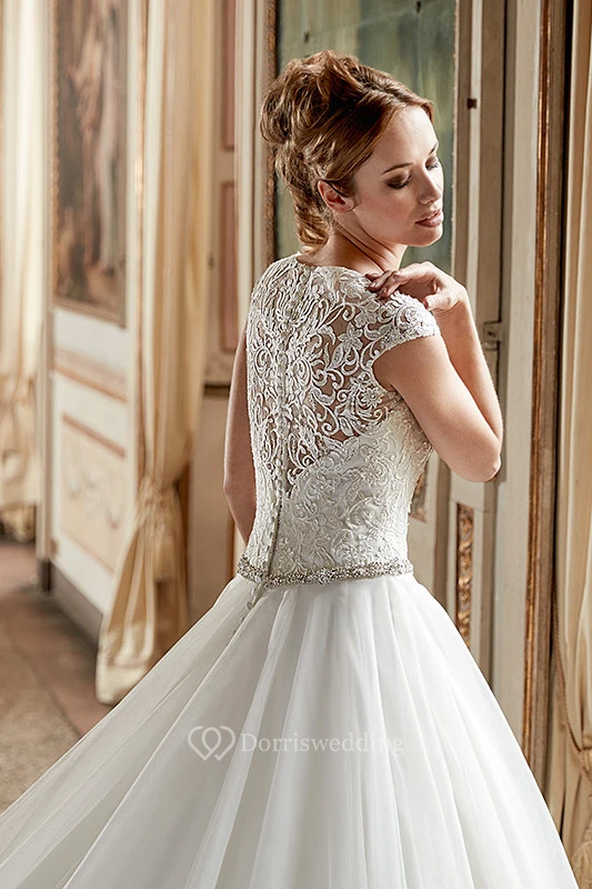 A-Line Appliqued Maxi Scoop-Neck Cap-Sleeve Tulle&Lace Wedding Dress With Waist Jewellery And Illusion