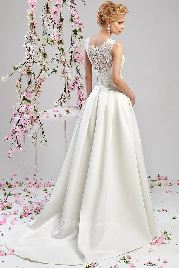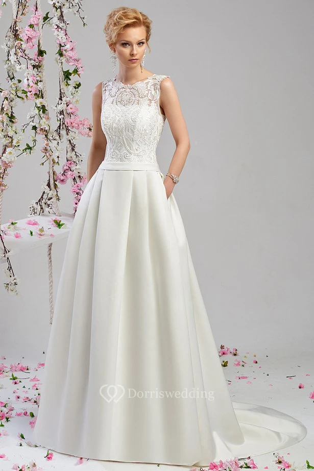 A-Line Appliqued Scoop-Neck Floor-Length Sleeveless Satin Wedding Dress With Embroidery