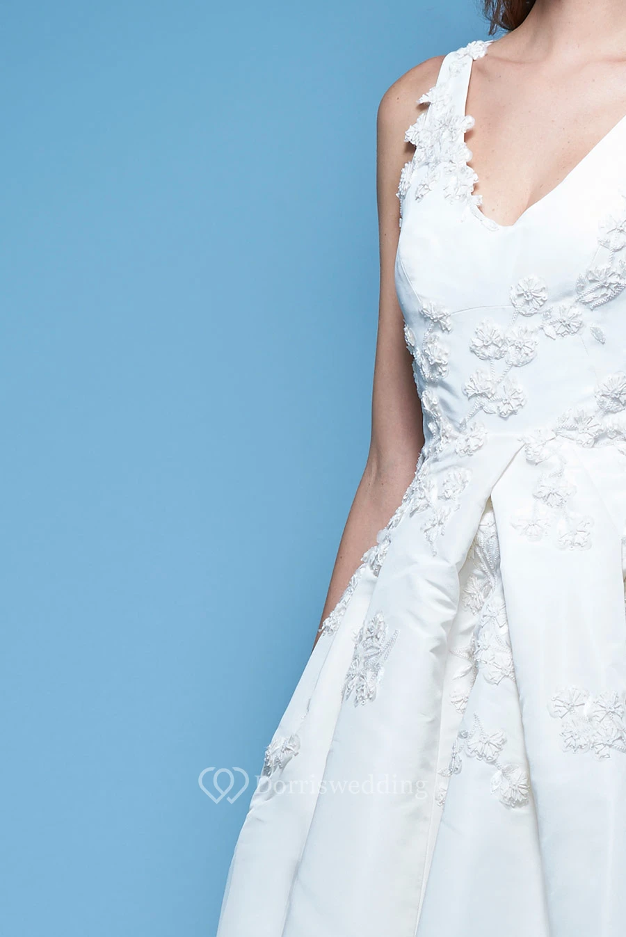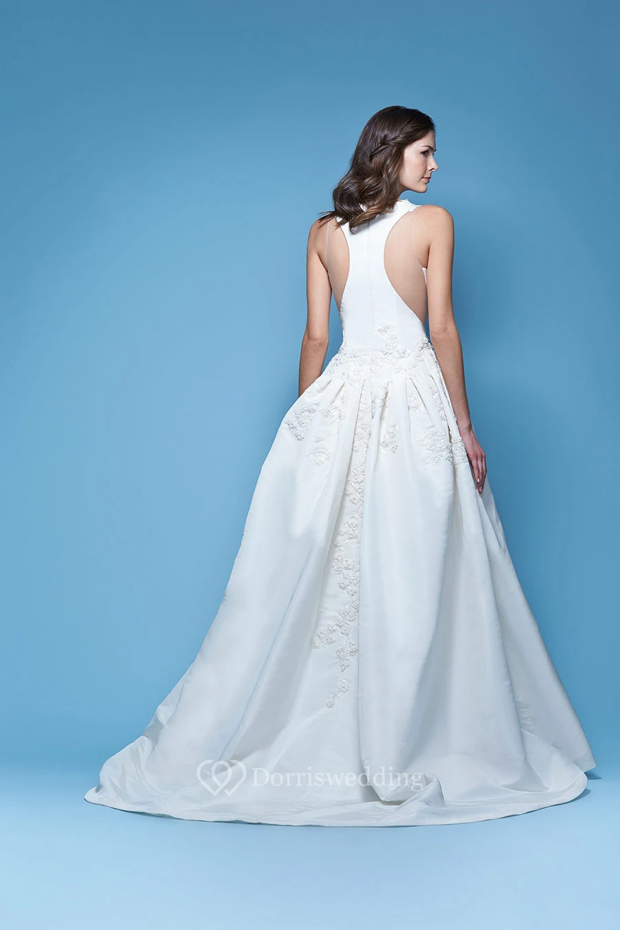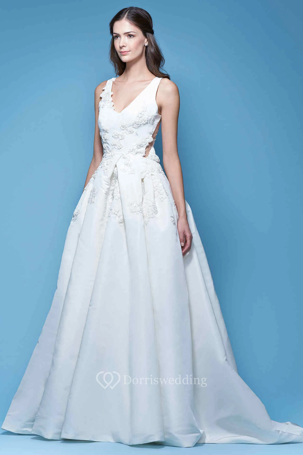 A-Line Appliqued Sleeveless Floor-Length V-Neck Satin Wedding Dress