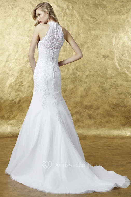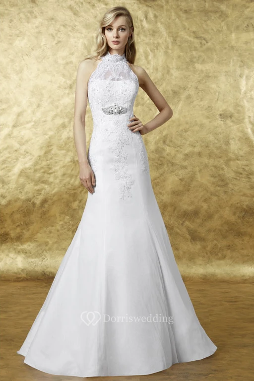 A-Line Appliqued Sleeveless High Neck Maxi Satin Wedding Dress With Illusion Back And Waist Jewellery