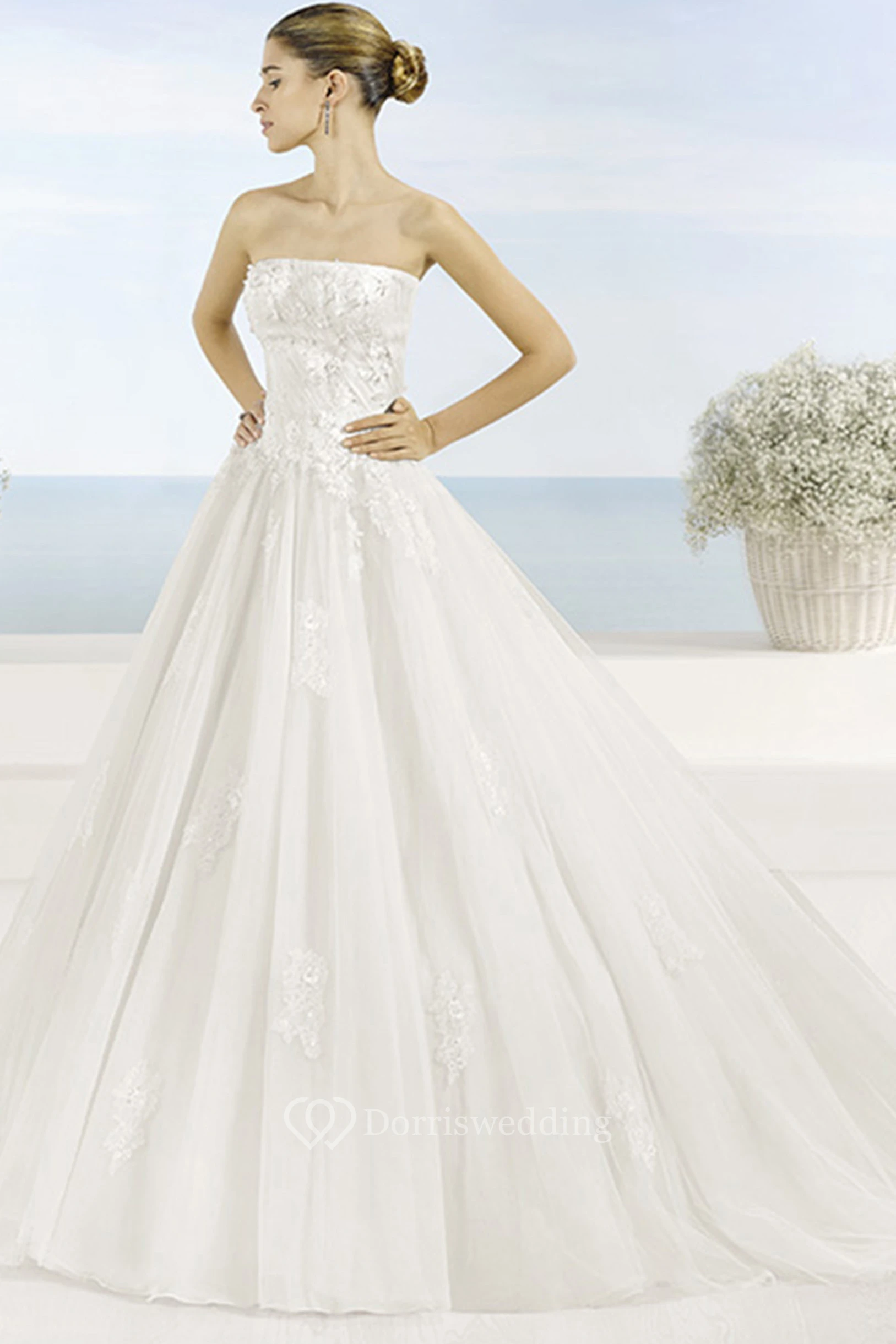 A-Line Appliqued Sleeveless Maxi Strapless Tulle Wedding Dress With Pleats And Backless Style