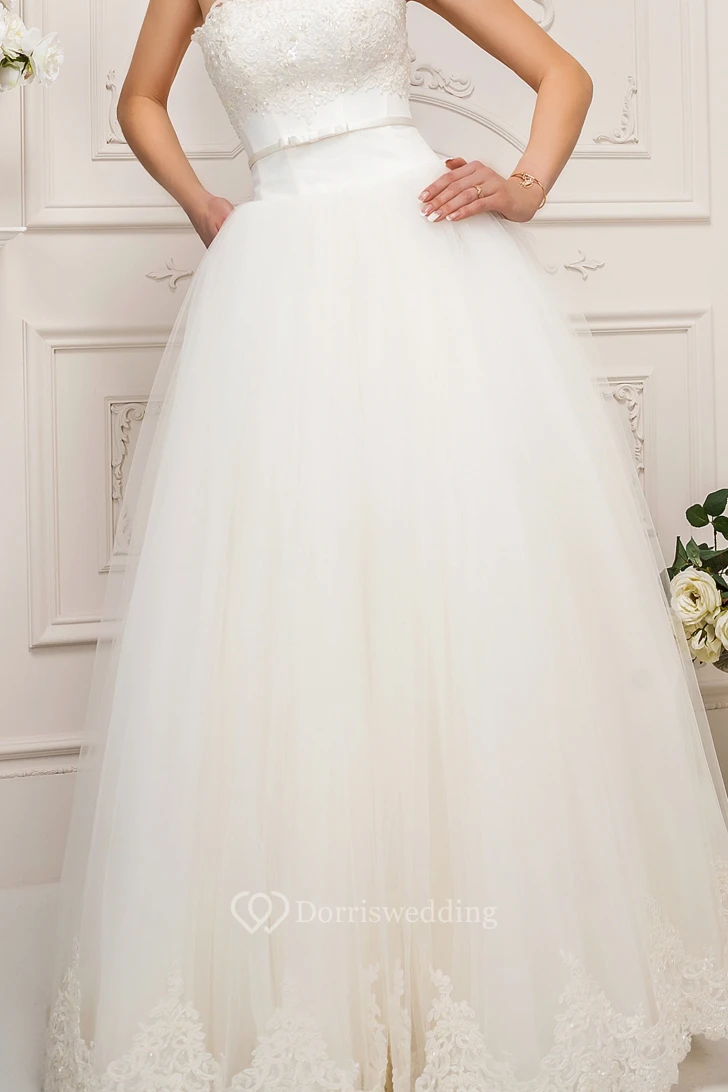 A-Line Appliqued Sleeveless Strapless Long Tulle Wedding Dress With Pleats