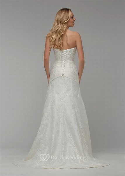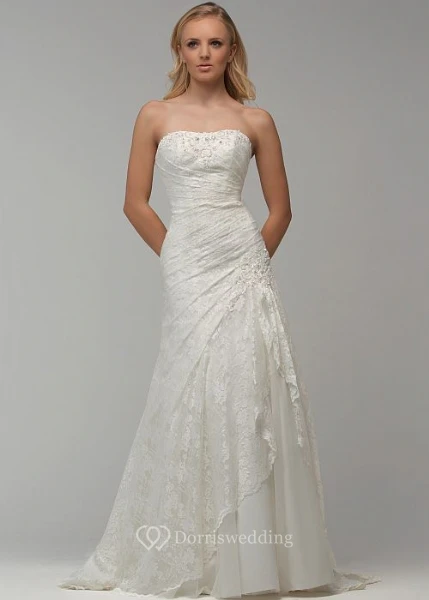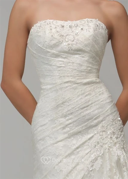 A-Line Appliqued Sleeveless Strapless Maxi Lace Wedding Dress With Side Draping And Beading