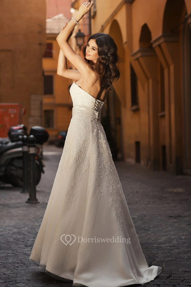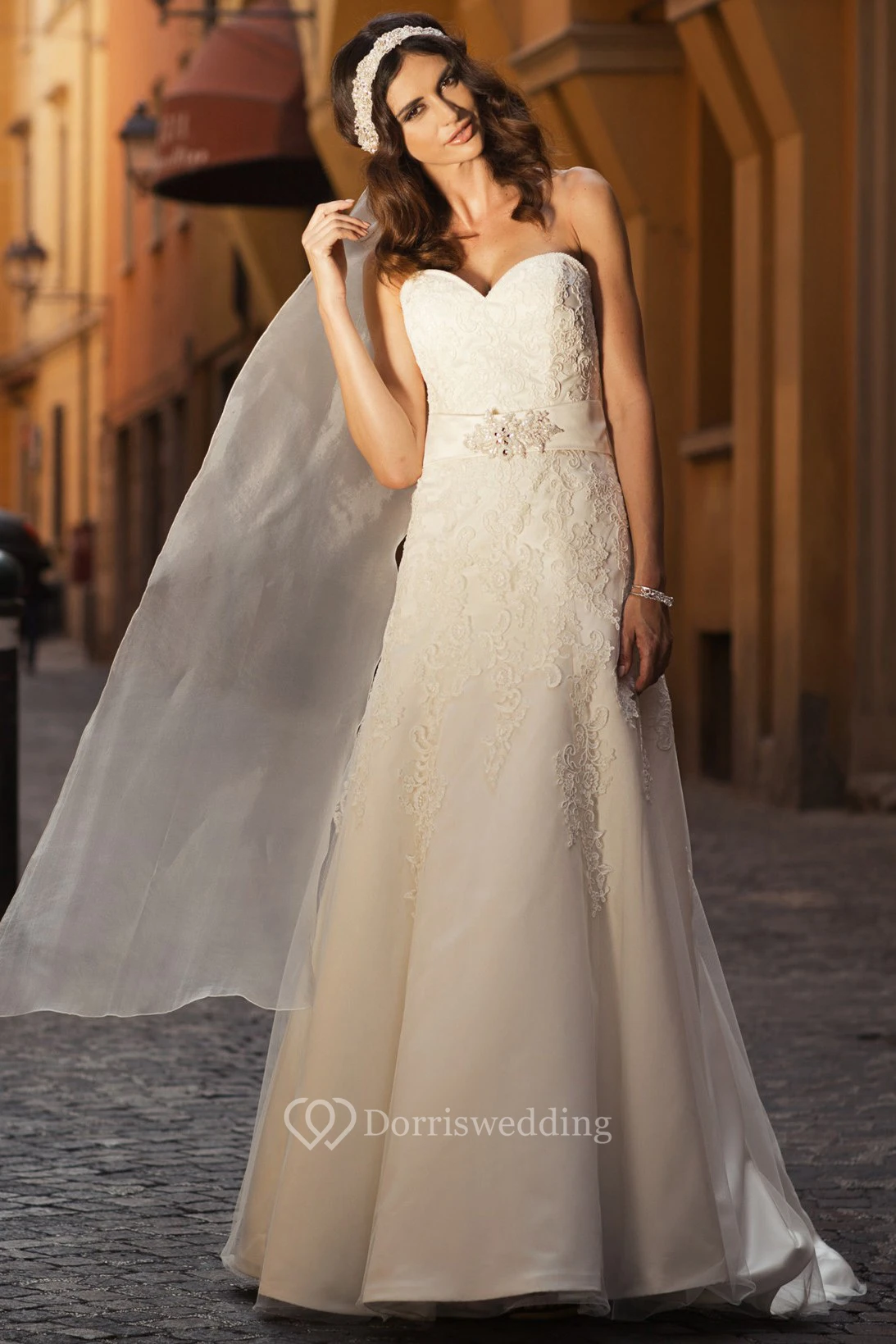 A-Line Appliqued Sleeveless Sweetheart Floor-Length Lace Wedding Dress With Waist Jewellery