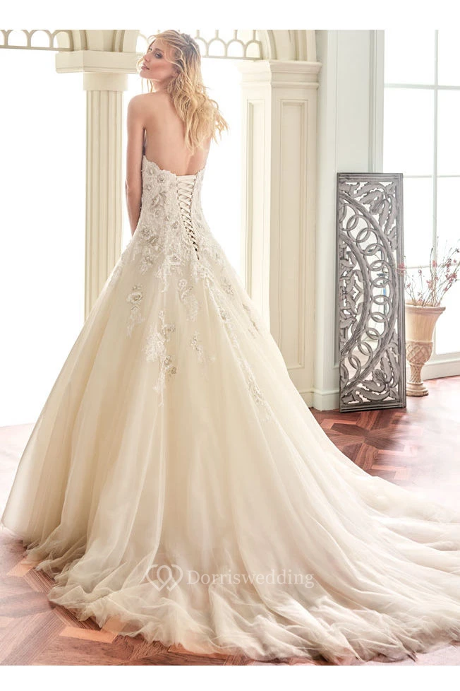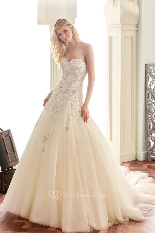 A-Line Appliqued Sleeveless Sweetheart Long Tulle&Lace Wedding Dress