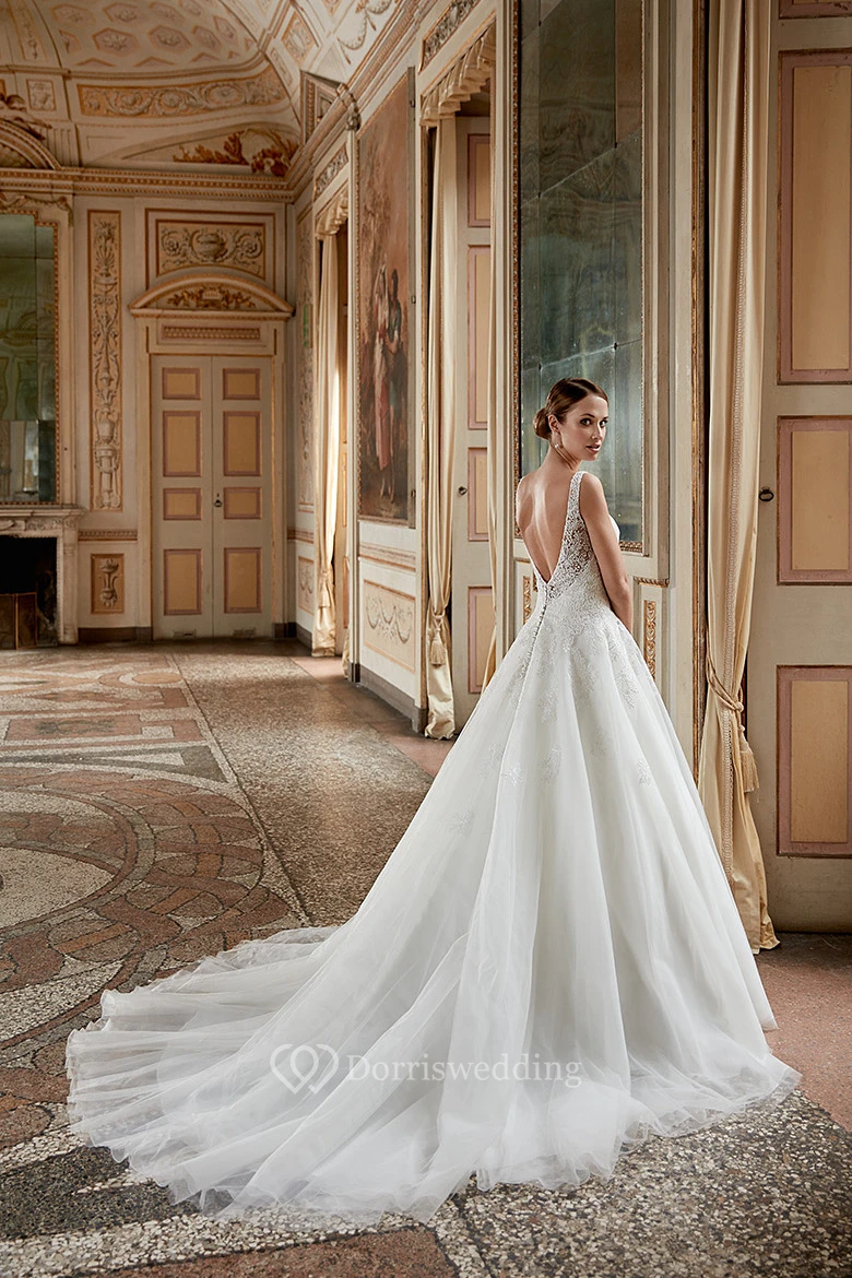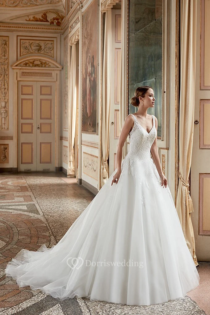 A-Line Appliqued Sleeveless V-Neck Floor-Length Tulle Wedding Dress With Ruffles