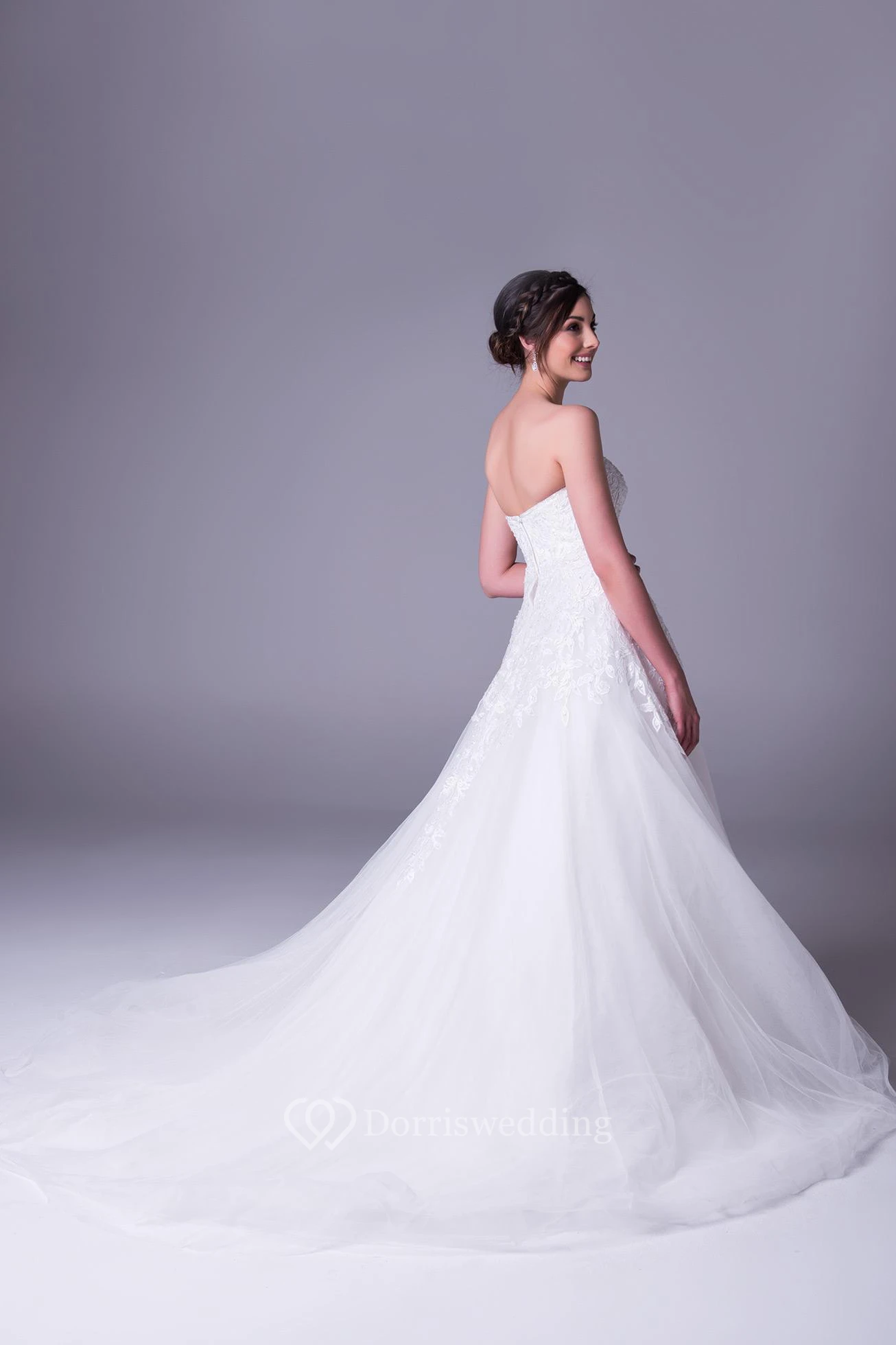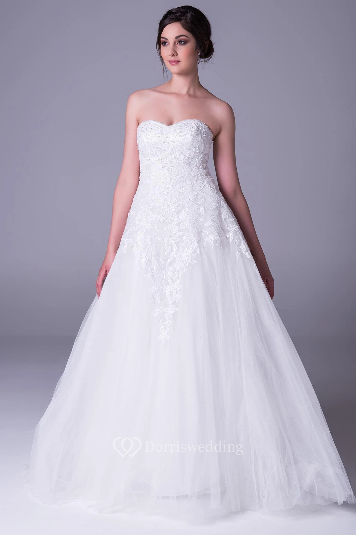 A-Line Appliqued Strapless Long Tulle Wedding Dress With Beading And Corset Back