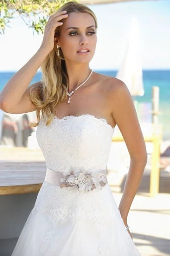 A-Line Appliqued Strapless Tulle Wedding Dress With Flower And Sweep Train