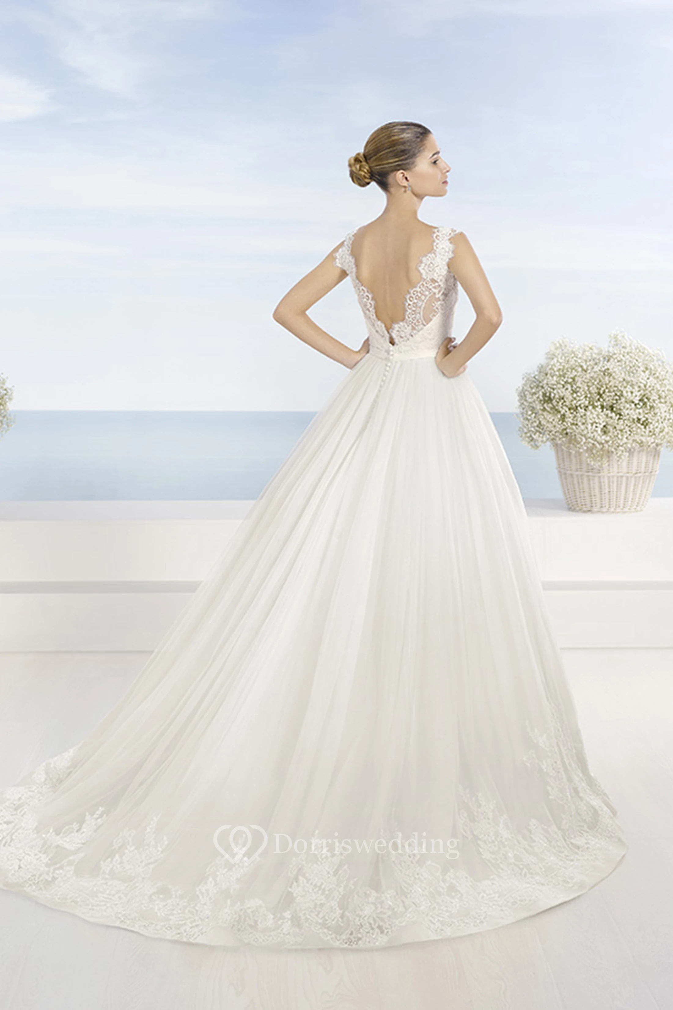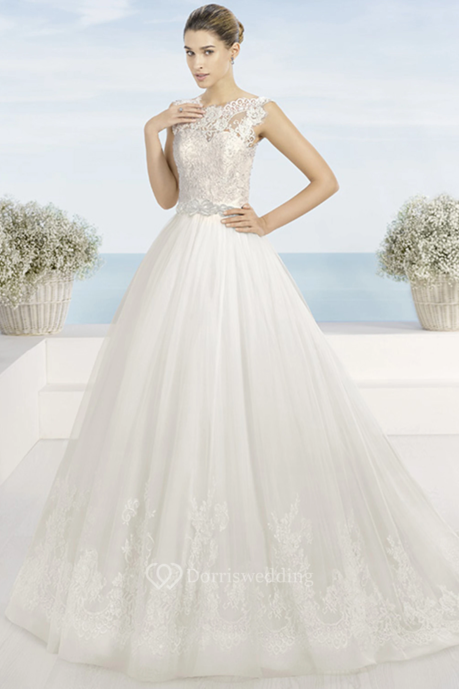 A-Line Ball-Gown Bateau Appliqued Floor-Length Sleeveless Lace Wedding Dress With Waist Jewellery And Low-V Back