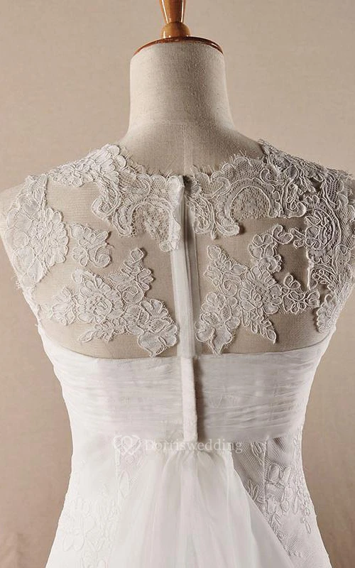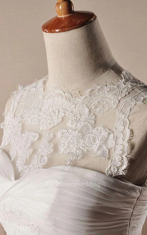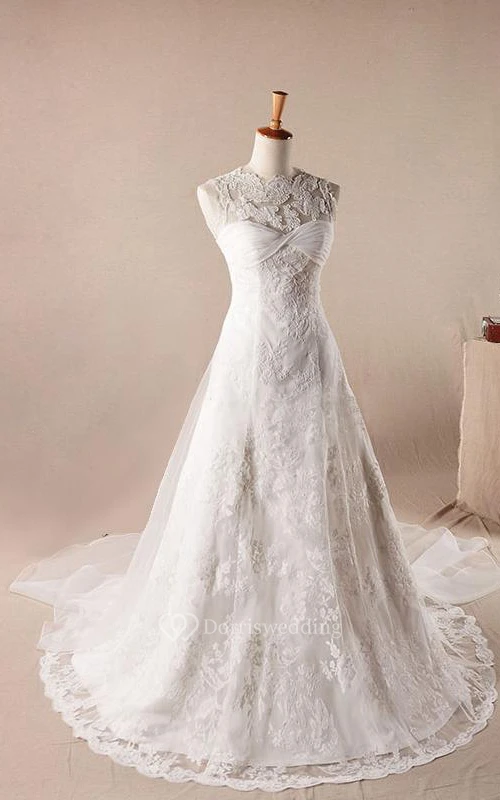 A-Line Ball Gown Floor-Length Off-The-Shoulder One-Shoulder Scoop Sleeveless Bell Pleats Appliques Embroidery Sweep Train Zipper Lace Dress